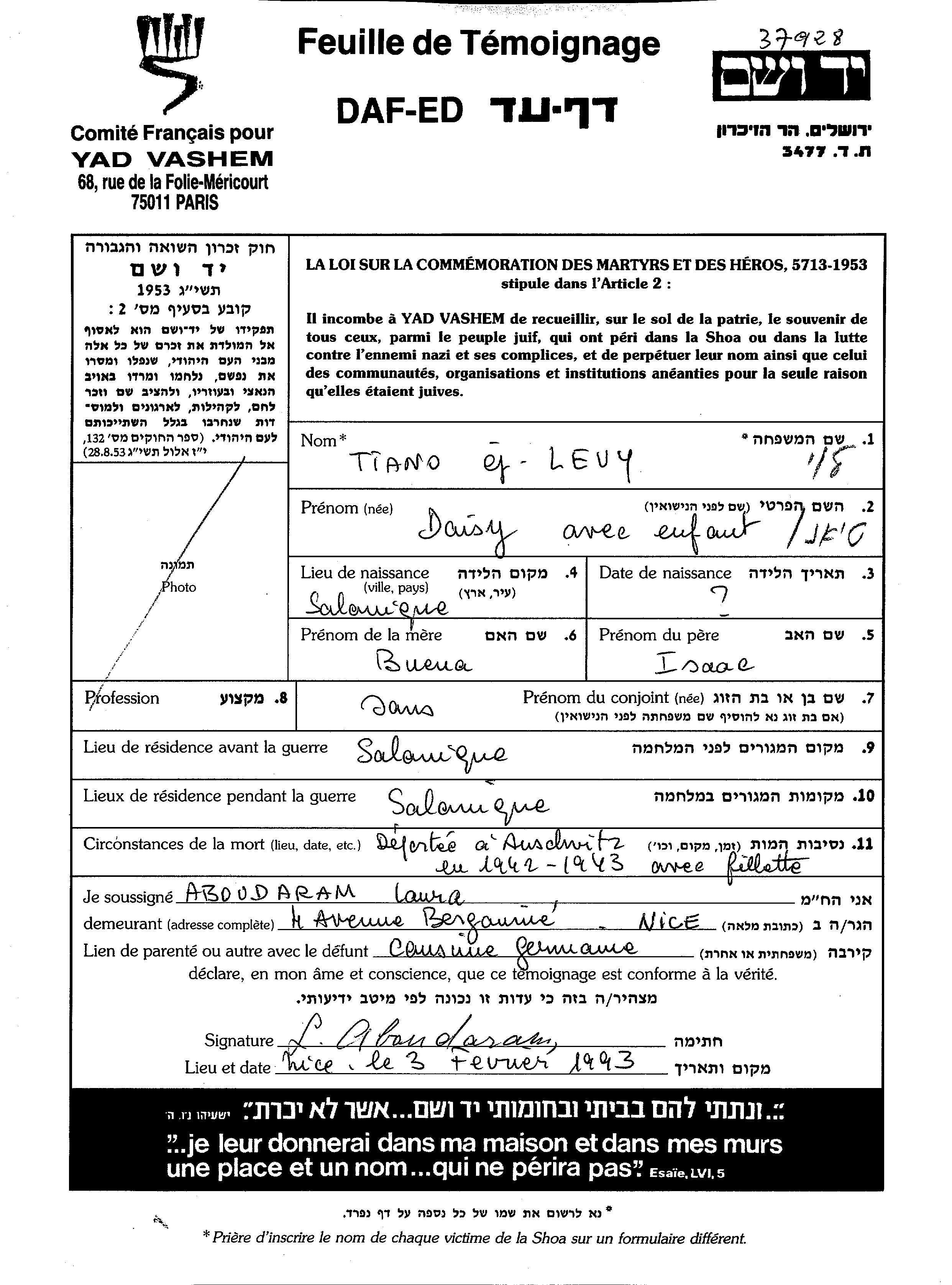 Daysi Deizi Levy, geb. Tiano wurde in Saloniki, Griechenland geboren. Sie war die Tochter von Isaac und Buena. Sie war Verheiratet. Vor dem Zweiten Weltkrieg lebte sie in Saloniki, Griechenland. Während des Krieges war sie in Saloniki, Griechenland.