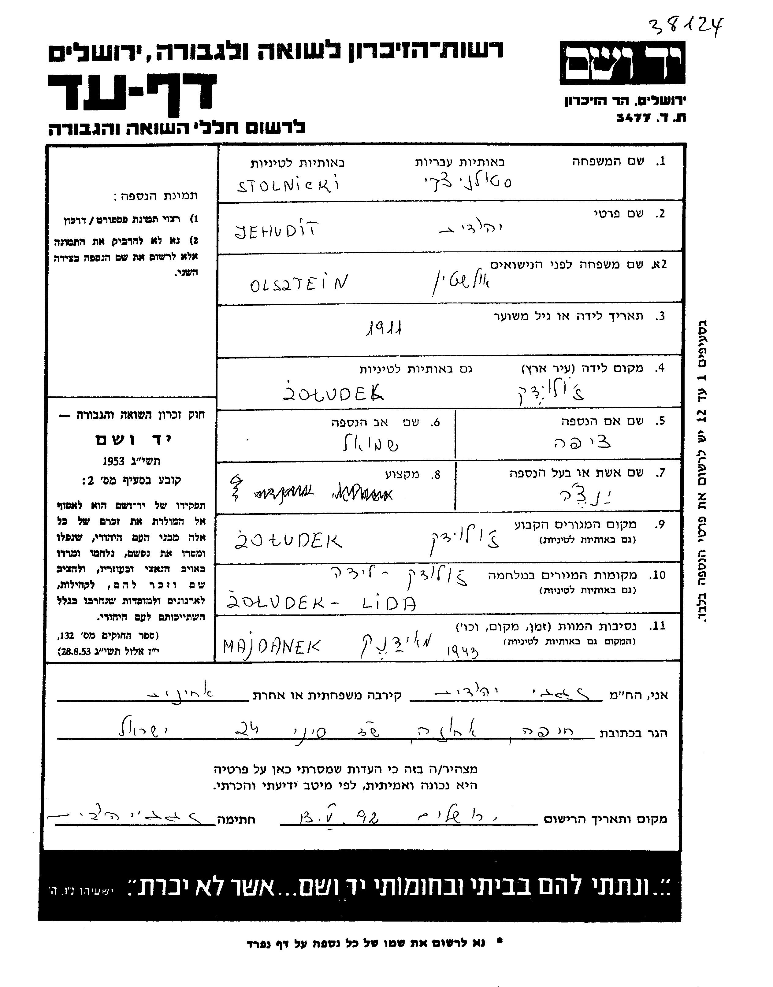 Jehudit Stolnicki, geb. Olsztein wurde im Jahr 1911 in Zoludek, Polen geboren. Sie war die Tochter von Schmuel und Cipa, geb. Beknstejn. Sie war mit Jancze Jacob Verheiratet. Vor dem Zweiten Weltkrieg lebte sie in Zoludek, Polen. Während des Krieges war sie in Lida, Polen.