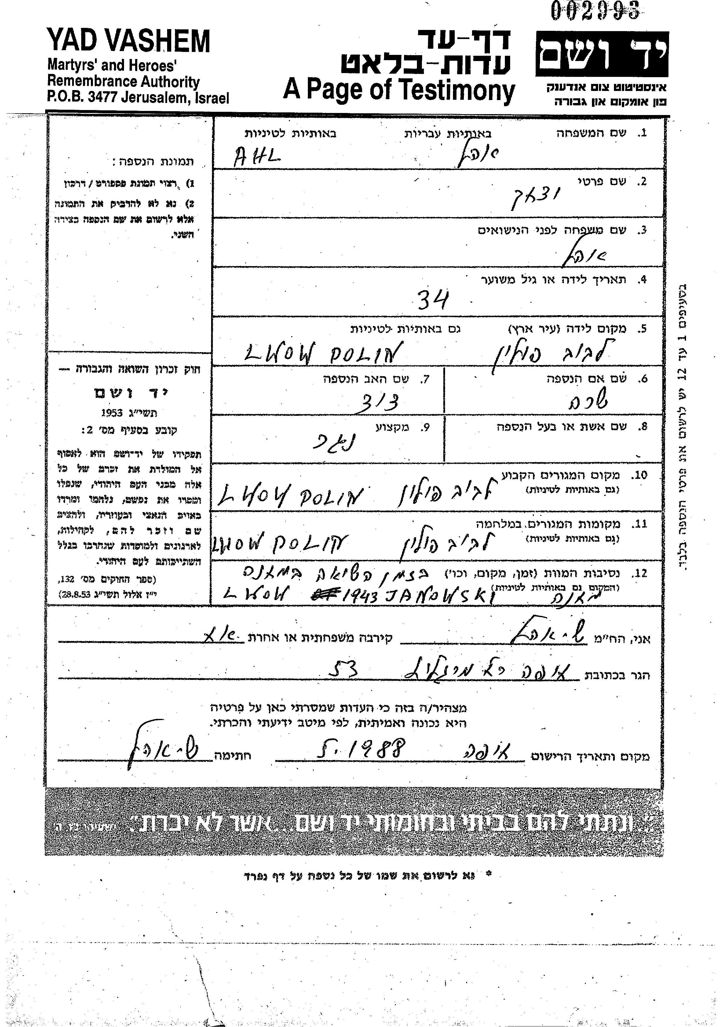 Yitzkhak wurde in der Schoah ermordet. Todesort: Janowska, Polen im Jahr 1943.