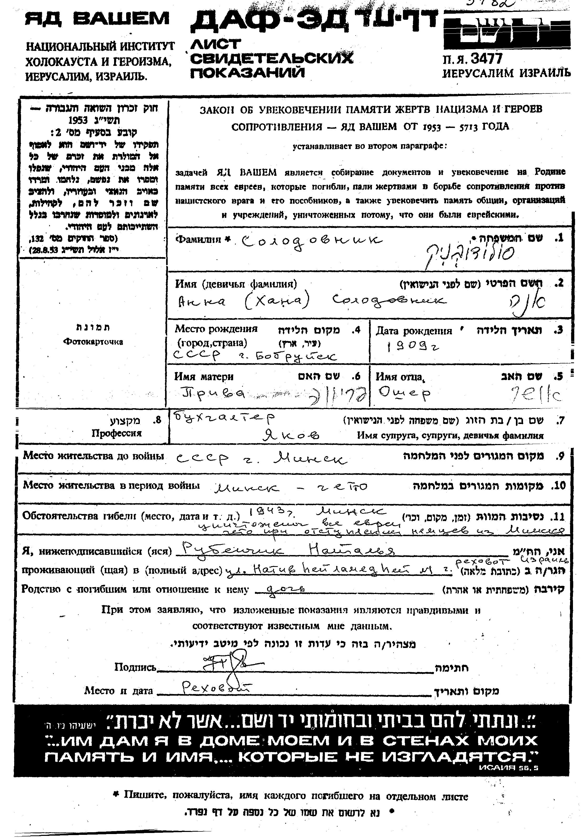 Anna Khana Solodovnik wurde im Jahr 1909 in Bobruysk, Weißrussland (UdSSR) geboren. Sie war die Tochter von Osher und Priva. Sie war Buchhalter/-in und mit Yakov Verheiratet. Vor dem Zweiten Weltkrieg lebte sie in Minsk, Weißrussland (UdSSR). Während des Krieges war sie in Minsk, Weißrussland (UdSSR).