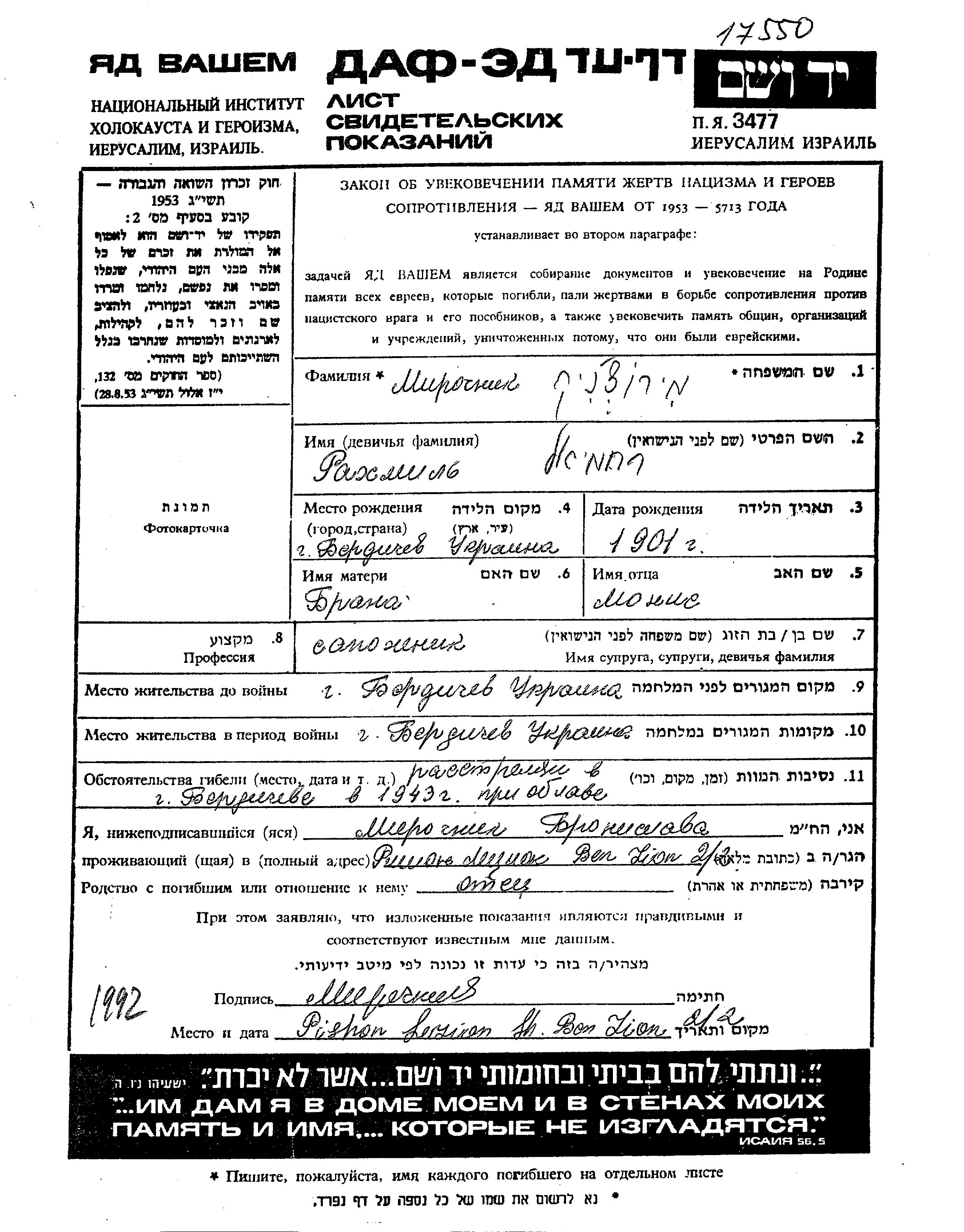Mirochnik Rakhmil 1901 Berdichev, Ukraine (UdSSR) Gedenkblatt