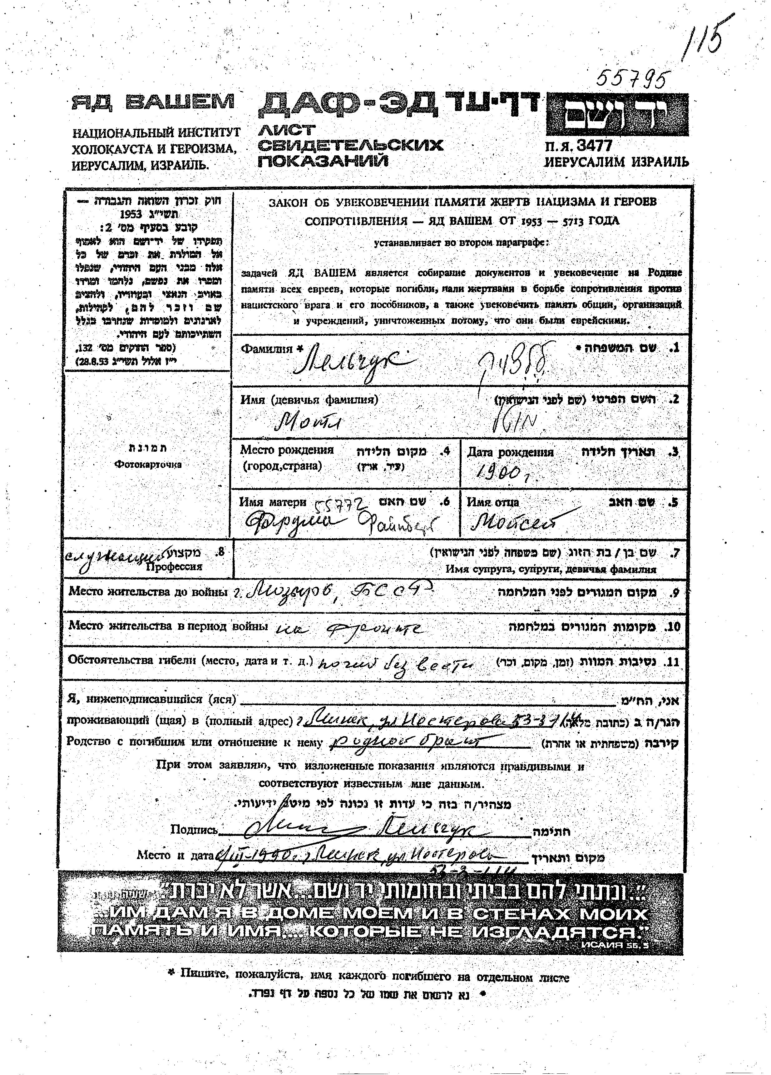 Motl Lelchuk wurde im Jahr 1900 geboren. Er war der Sohn von Moisei und Fruma, geb. Fainberg. Er war Angestellte/-r. Vor dem Zweiten Weltkrieg lebte er in Mozyr, Weißrussland (UdSSR). Während des Krieges war er in die Sowjetischen Streitkräfte.