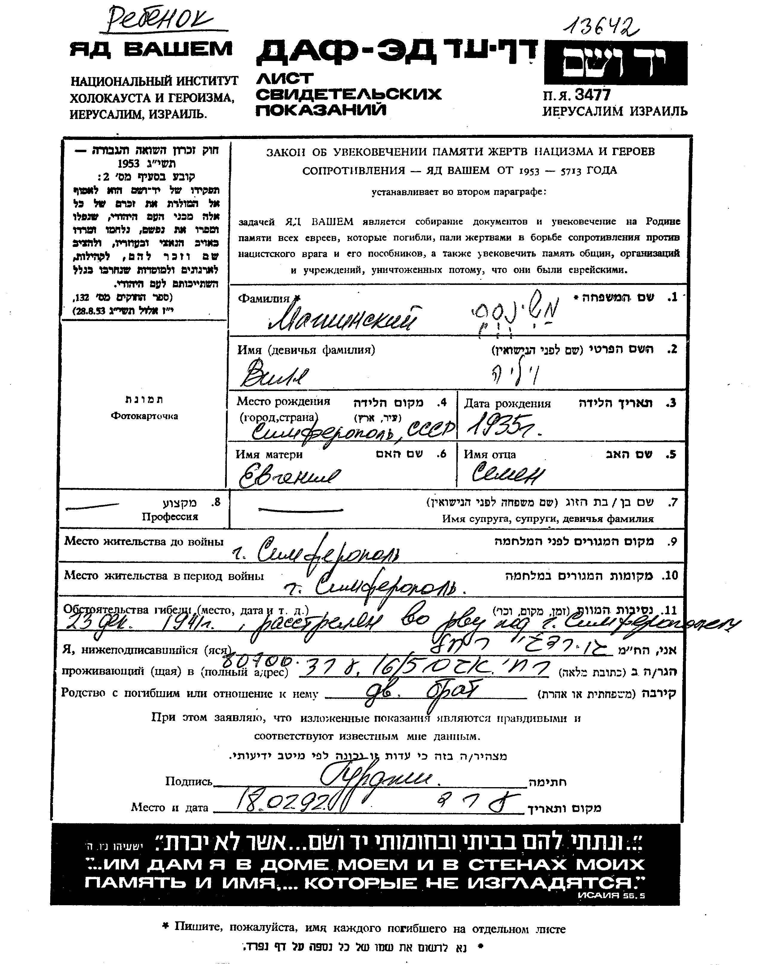 Vilhelm Vilia Mashinski wurde im Jahr 1935 in Simferopol, Russland (UdSSR) geboren. Er war der Sohn von Semion und Yevgenia. Er war Kind. Vor dem Zweiten Weltkrieg lebte er in Simferopol, Russland (UdSSR). Während des Krieges war er in Simferopol, Russland (UdSSR).