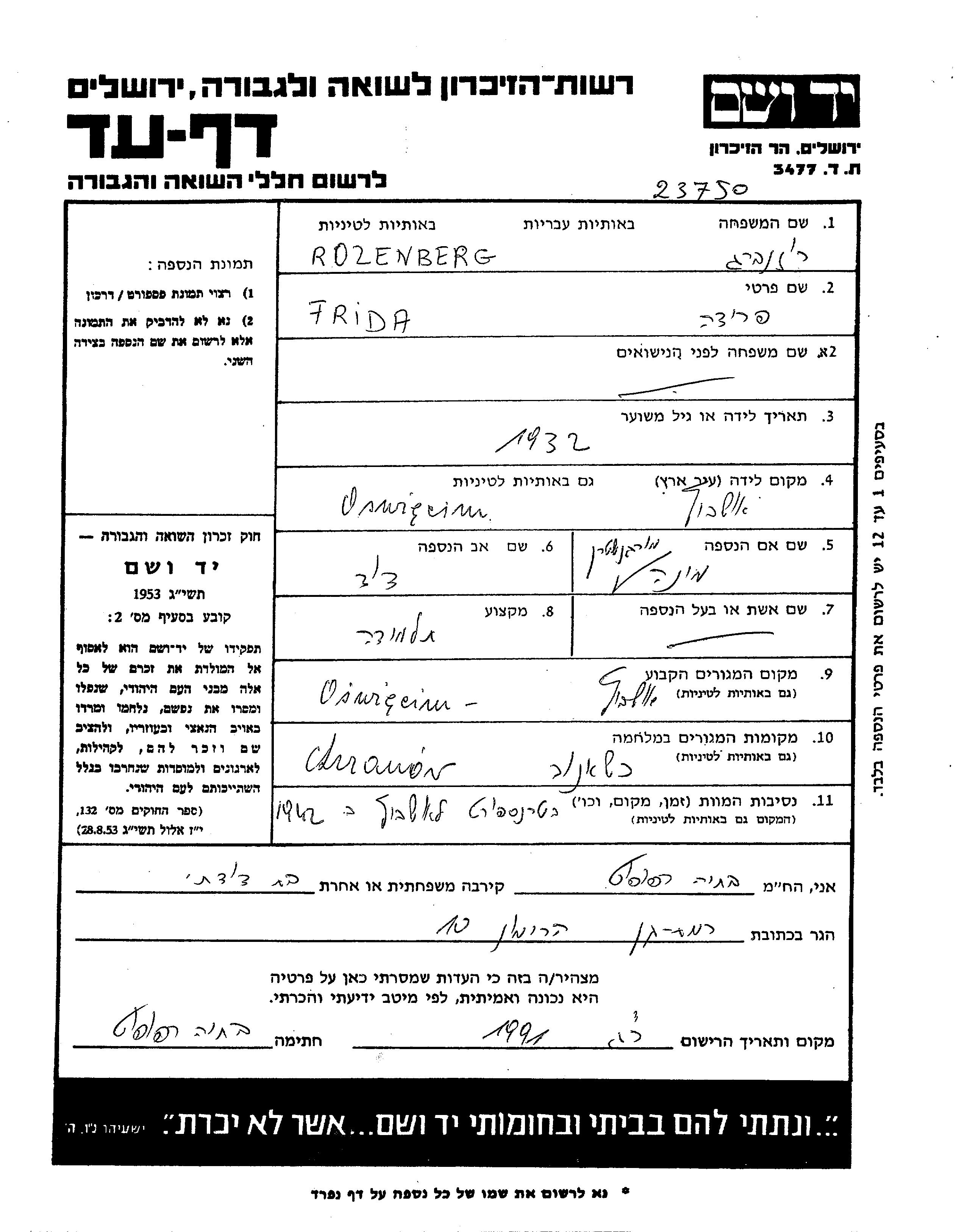 Frida Rosenberg wurde im Jahr 1932 in Oświęcim, Polen geboren. Sie war die Tochter von David und Mina, geb. Morgenstern. Sie war Schüler/-in und Kind. Vor dem Zweiten Weltkrieg lebte sie in Oświęcim, Polen. Während des Krieges war sie in Chrzanow, Polen.