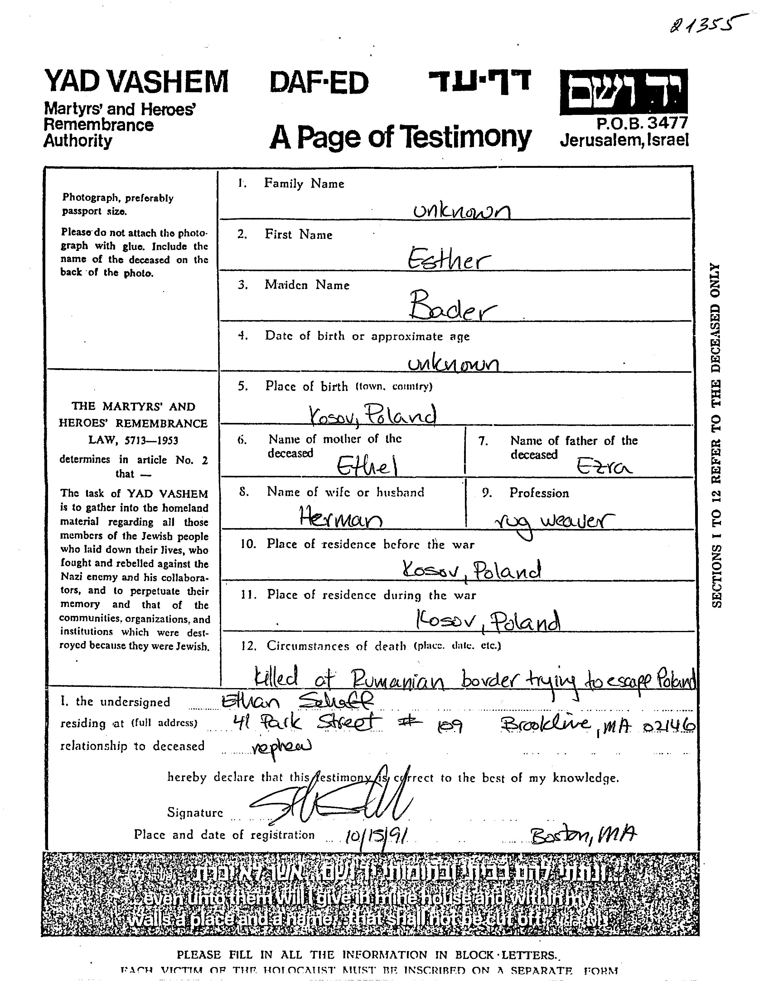 Esther Name unbekannt, geb. Bader wurde in Kosow, Polen geboren. Sie war die Tochter von Ezra und Ethel. Sie war Handwerker und mit Herman Verheiratet. Vor dem Zweiten Weltkrieg lebte sie in Kosow, Polen. Während des Krieges war sie in Kosow, Polen.