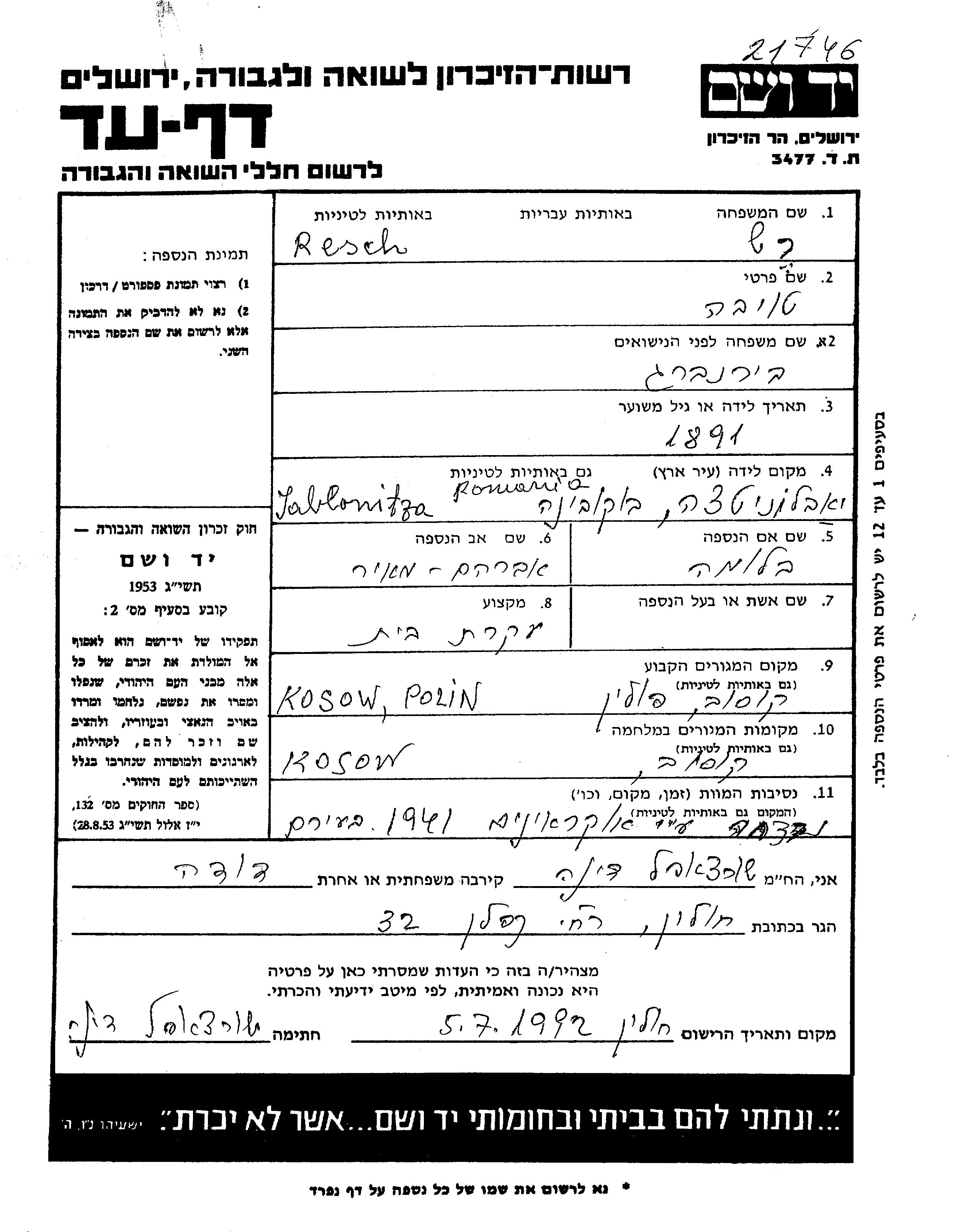 Toibe Resch Rash, geb. Birnberg wurde im Jahr 1891 in Iablonita, Rumänien geboren. Sie war die Tochter von Abraham Meir und Bluma. Sie war Hausfrau und mit Shlomo Verheiratet. Vor dem Zweiten Weltkrieg lebte sie in Kosow Stary, Polen. Während des Krieges war sie in Kosow Stary, Polen.