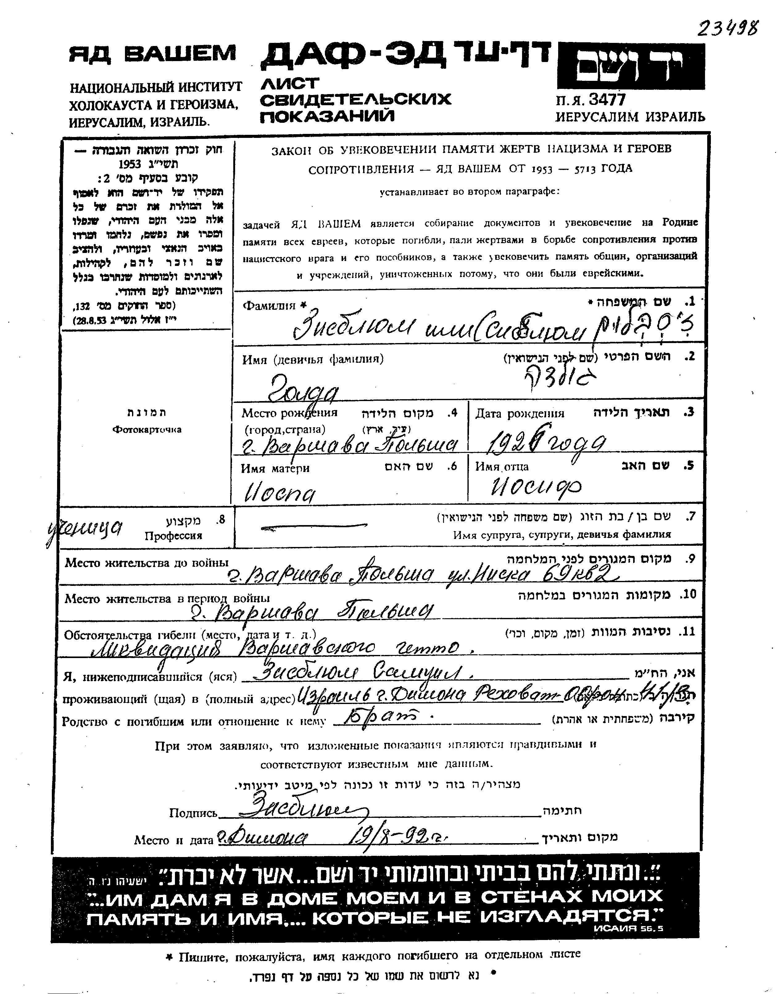 Golda Zisblyum wurde im Jahr 1926 in Warszawa, Polen geboren. Sie war die Tochter von Iosif und Iospa Yosefa, geb. Zholonch. Sie war Schüler/-in und Kind. Vor dem Zweiten Weltkrieg lebte sie in Warszawa, Polen. Während des Krieges war sie in Warszawa, Polen.