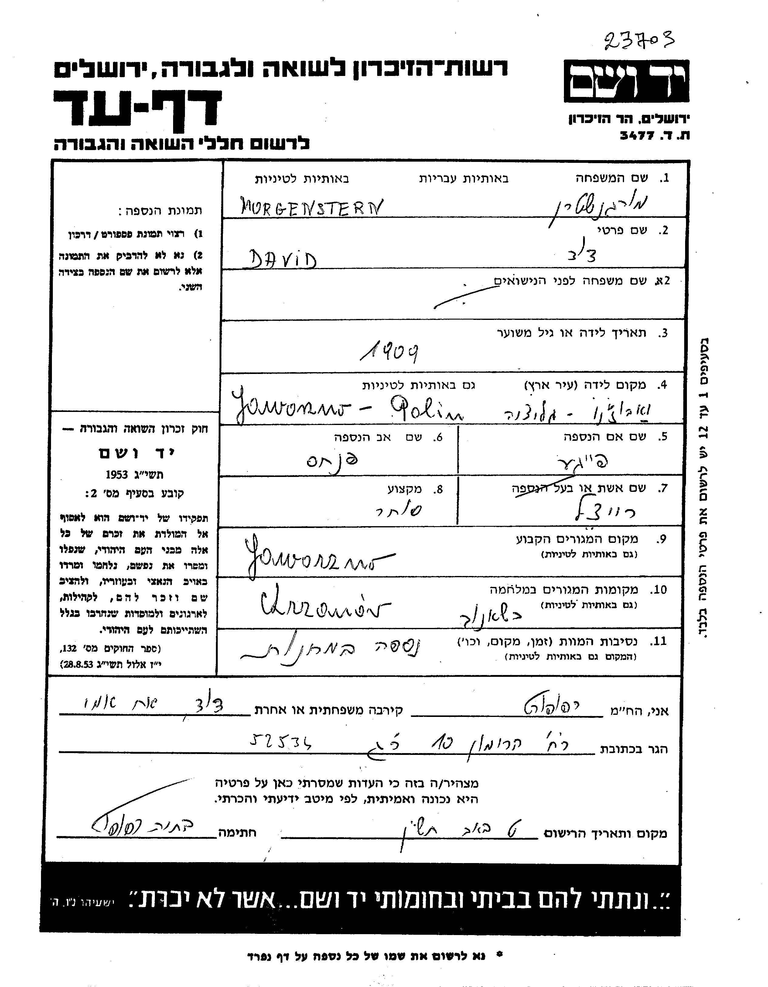 Morgenstern David 1909 Jaworzno, Polen Gedenkblatt