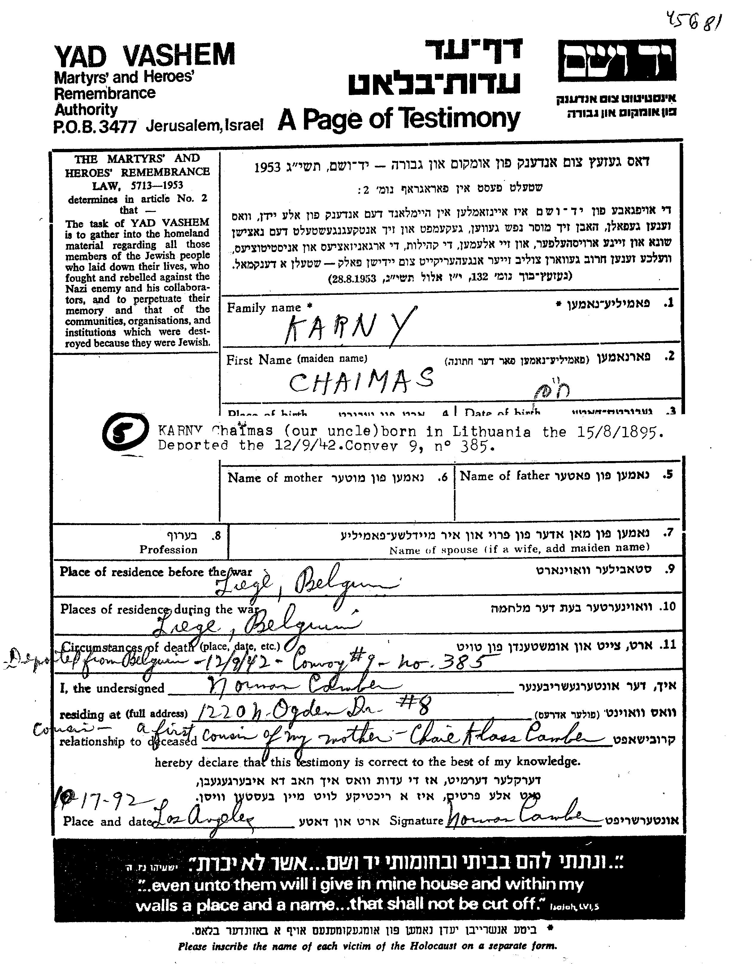 Chaimas Karny wurde im Jahr 1895 in Litauen geboren. Er war mit Basia Racha Verheiratet. Vor dem Zweiten Weltkrieg lebte er in Liege, Belgien. Während des Krieges war er in Liege, Belgien.