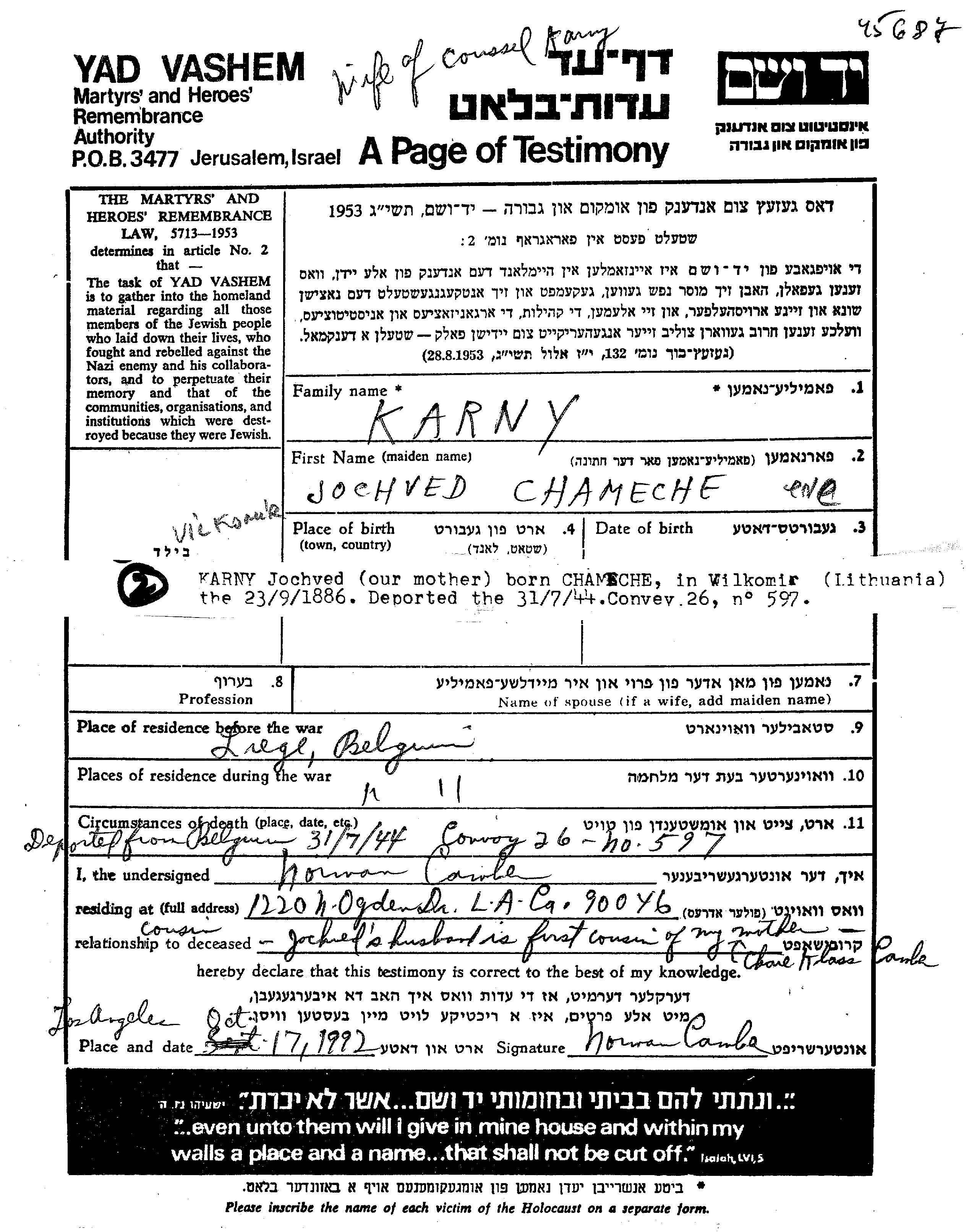 Jocheved Karny, geb. Chameche wurde im Jahr 1886 in Vilkomir, Litauen geboren. Sie war mit Coussel Verheiratet. Vor dem Zweiten Weltkrieg lebte sie in Liege, Belgien. Während des Krieges war sie in Liege, Belgien.