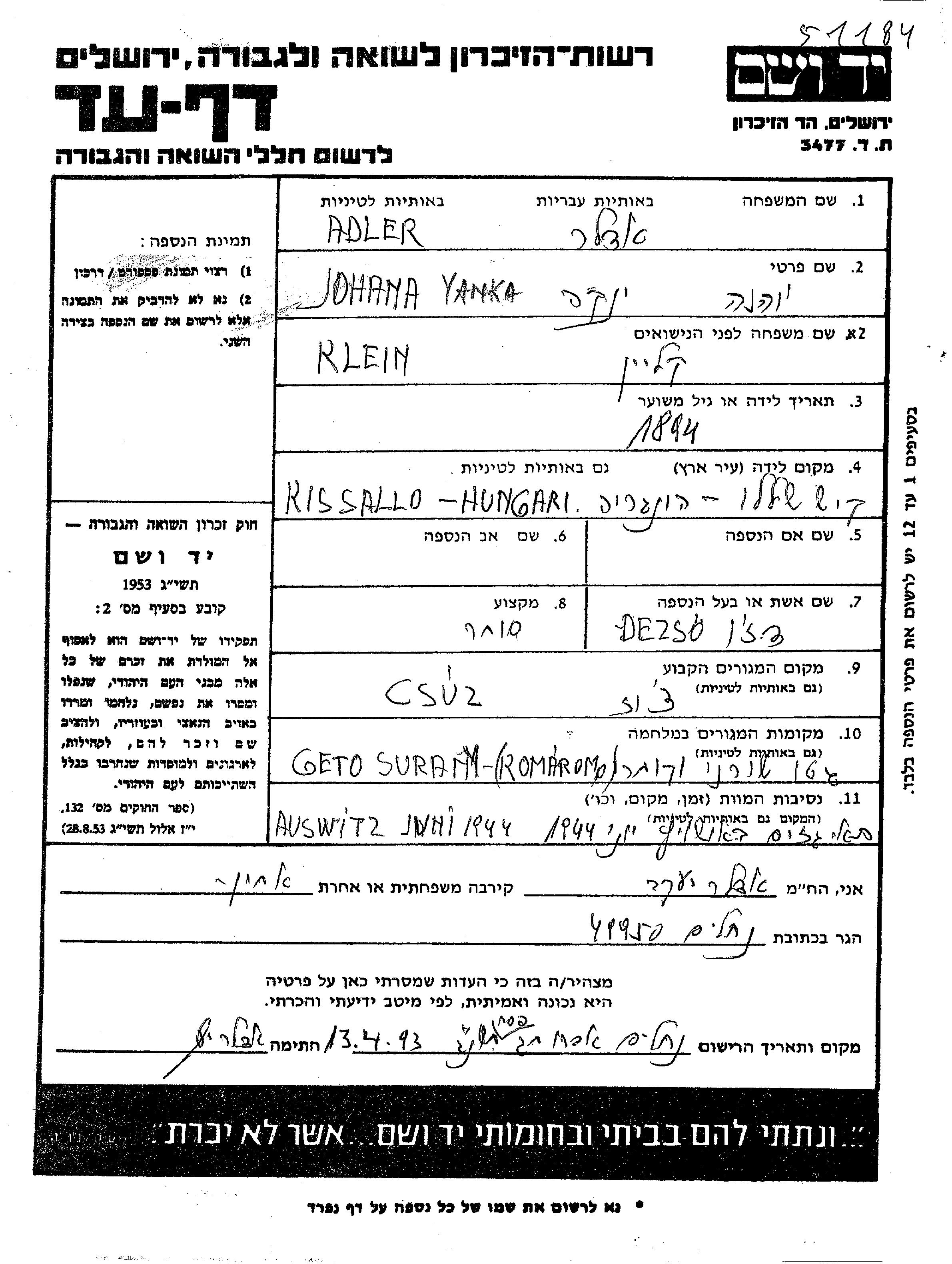Johana Yanka Adler, geb. Klein wurde im Jahr 1894 in Kissallo, Tschechoslowakei geboren. Sie war Kaufmann/-frau und mit Dezso Verheiratet. Vor dem Zweiten Weltkrieg lebte sie in Csuz, Tschechoslowakei. Während des Krieges war sie in Surany, Tschechoslowakei.