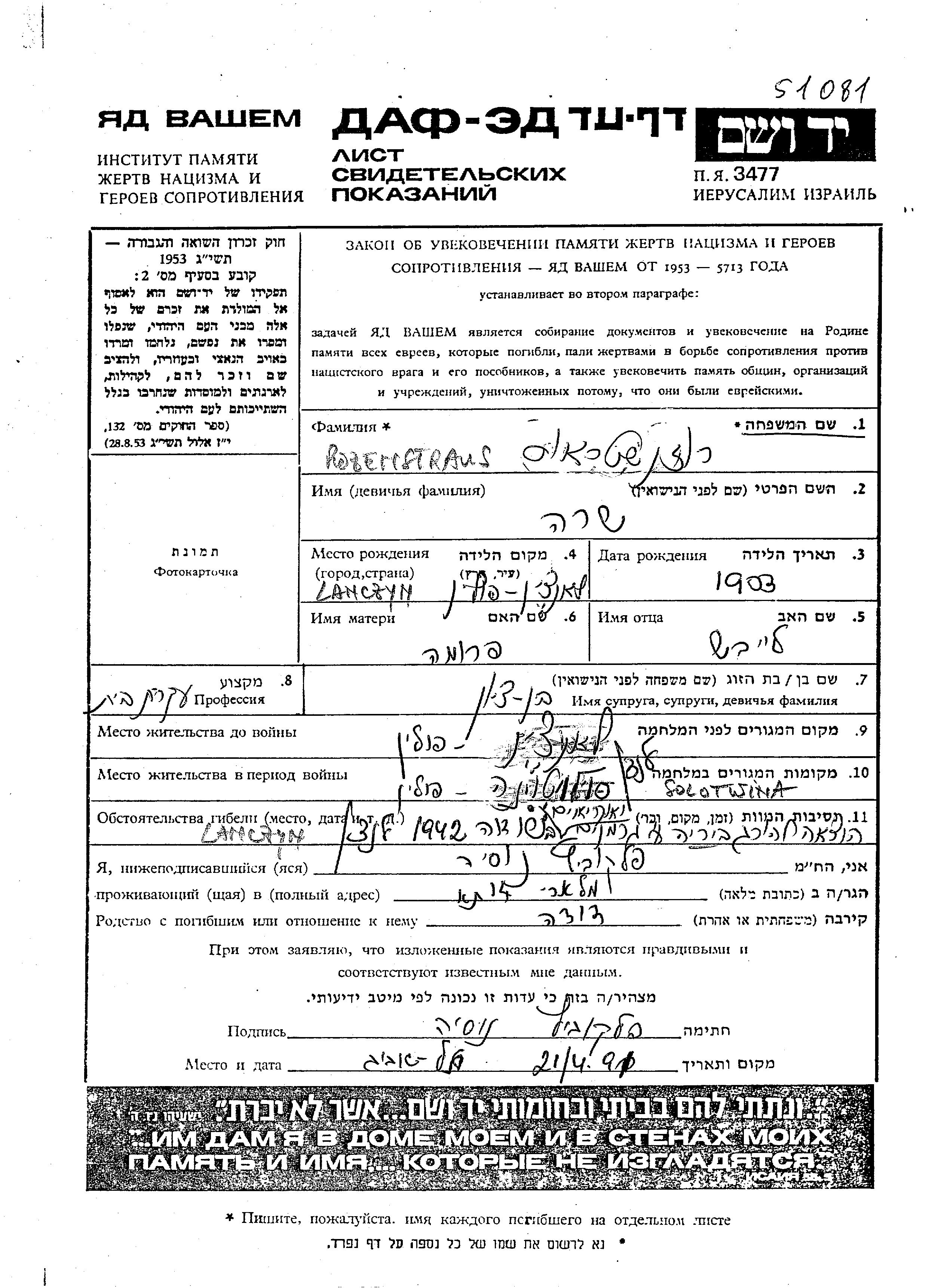 Sara Rozenstraus wurde im Jahr 1903 in Lanczyn, Polen geboren. Sie war die Tochter von Leibush und Fruma. Sie war Hausfrau und mit Bentzion Verheiratet. Vor dem Zweiten Weltkrieg lebte sie in Lanczyn, Polen. Während des Krieges war sie in Solotwina, Polen.