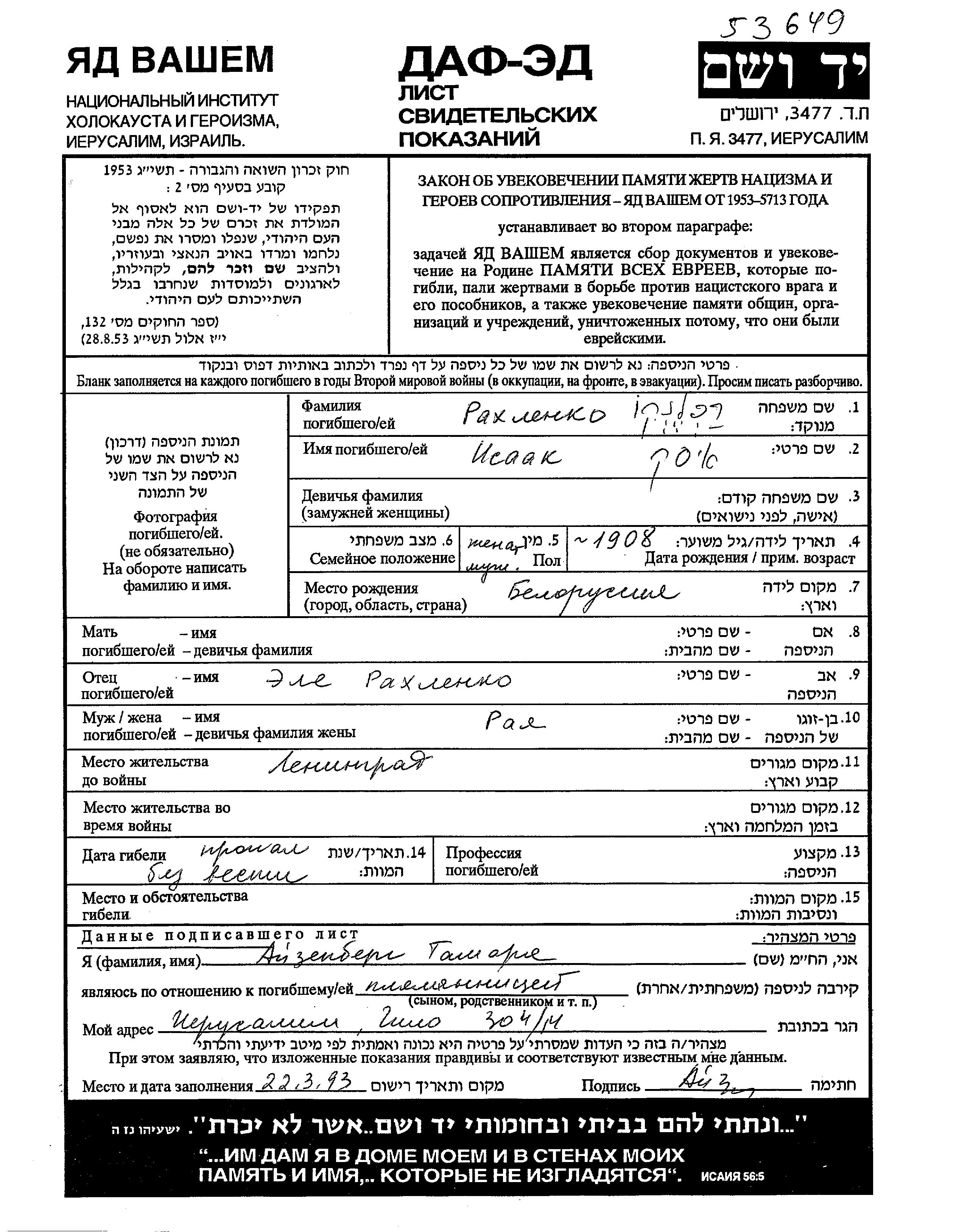 Isaak Rakhlenko wurde im Jahr 1908 in Weißrussland (UdSSR) geboren. Er war der Sohn von Elia. Er war mit Raia Verheiratet. Vor dem Zweiten Weltkrieg lebte er in Leningrad, Russland (UdSSR). Während des Krieges war er in die Sowjetischen Streitkräfte.