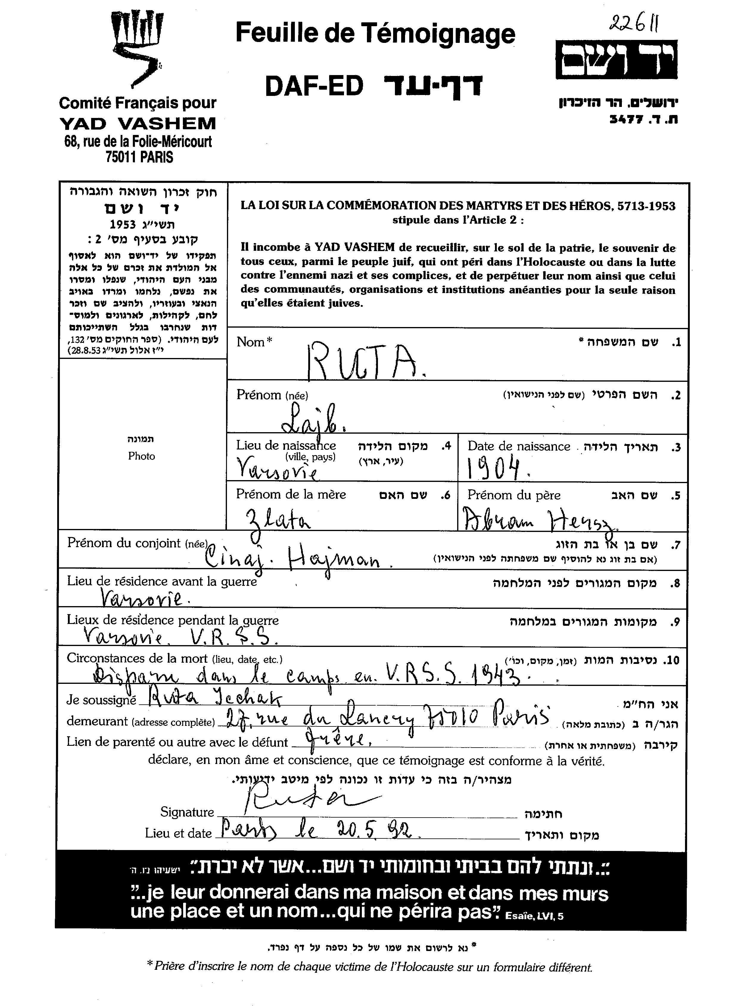 Lajb Ruta wurde im Jahr 1904 in Warszawa, Polen geboren. Er war der Sohn von Abram Hersz und Zlata, geb. Rubinstein. Er war mit Cinaj Verheiratet. Vor dem Zweiten Weltkrieg lebte er in Warszawa, Polen. Während des Krieges war er in Warszawa, Polen.