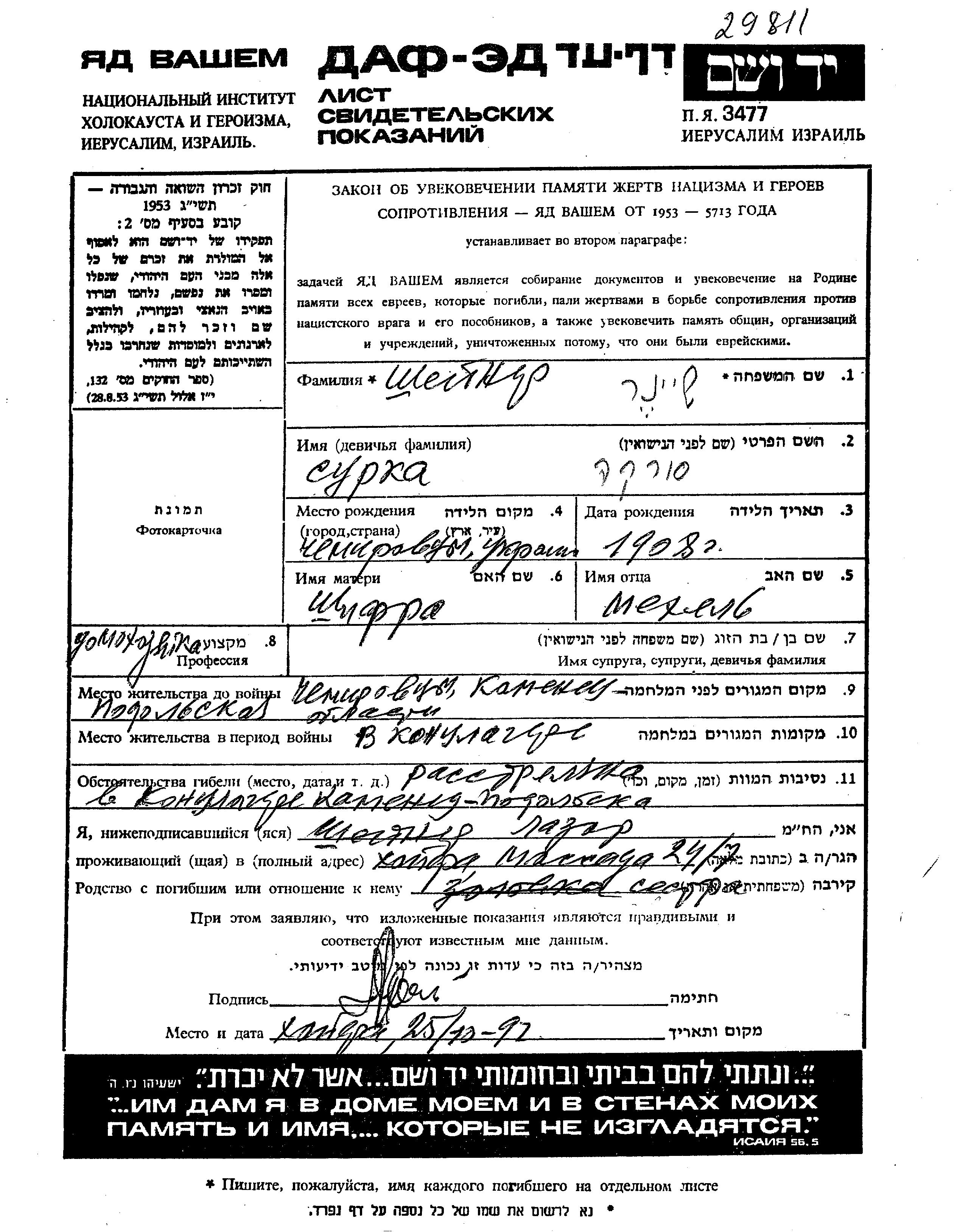 Surka Sheiner wurde im Jahr 1908 in Chemerovtsy, Ukraine (UdSSR) geboren. Sie war die Tochter von Mekhel und Shifra. Sie war Hausfrau. Vor dem Zweiten Weltkrieg lebte sie in Chemerovtsy, Ukraine (UdSSR). Während des Krieges war sie in Kamenets Podolskiy, Ukraine (UdSSR).