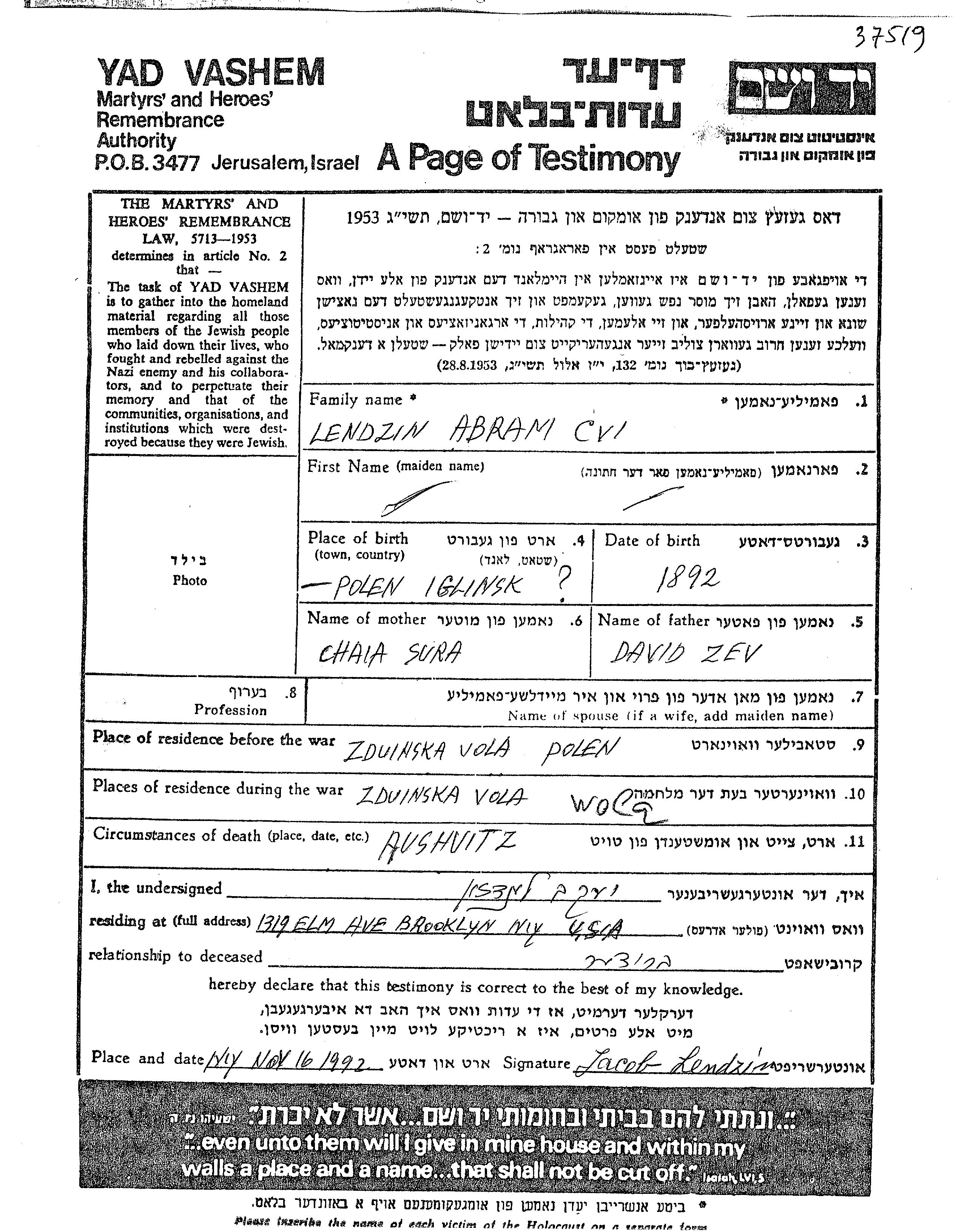 Abram Cvi Lendzin wurde im Jahr 1892 in Polen geboren. Er war der Sohn von David Zeev und Chaia Sura. Vor dem Zweiten Weltkrieg lebte er in Zdunska Wola, Polen. Während des Krieges war er in Zdunska Wola, Polen.
