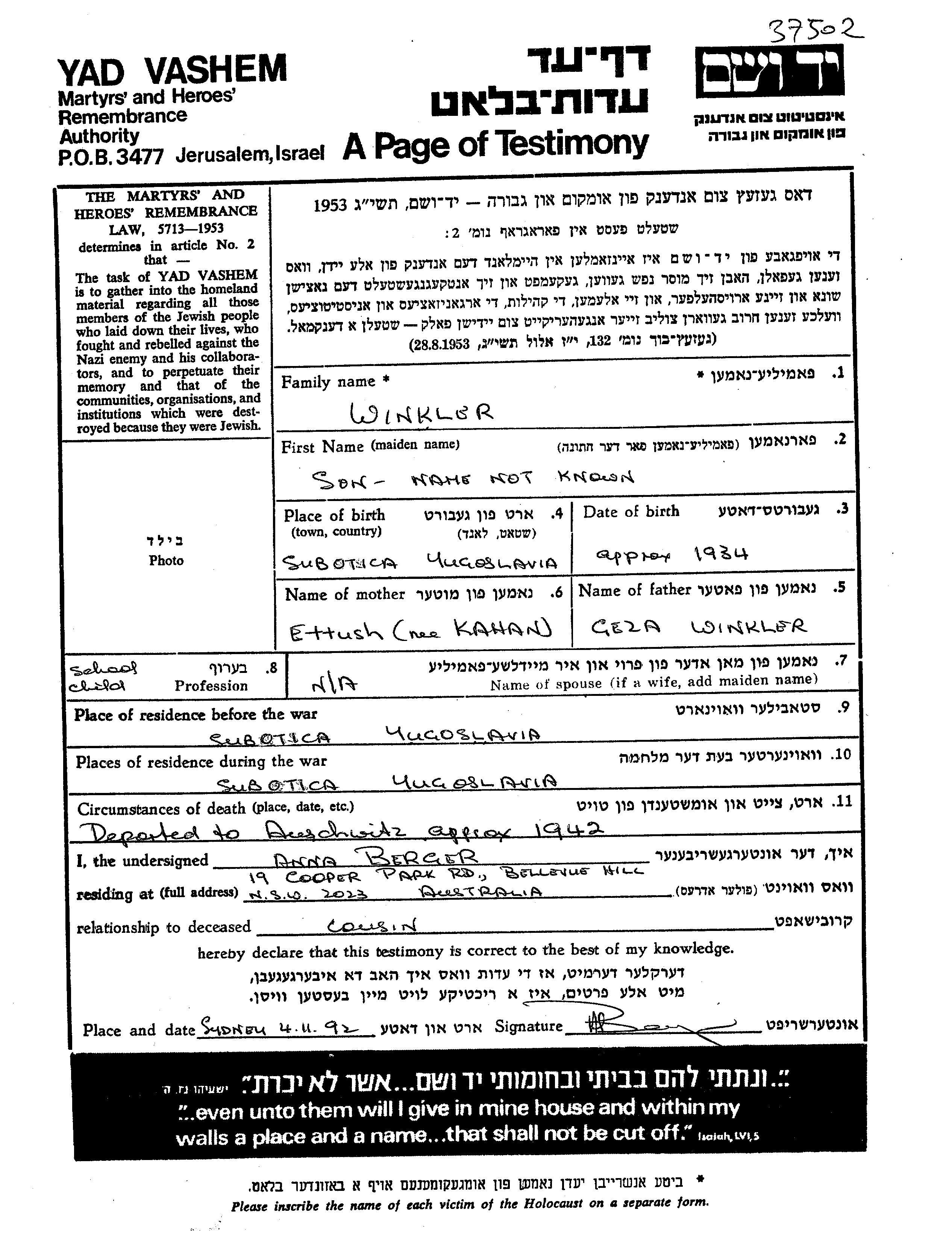 Vorname unbekannt Winkler wurde im Jahr 1934 in Subotica, Jugoslawien geboren. Er war der Sohn von Geza und Ettush, geb. Kahan. Er war Kind. Vor dem Zweiten Weltkrieg lebte er in Subotica, Jugoslawien. Während des Krieges war er in Subotica, Jugoslawien.
