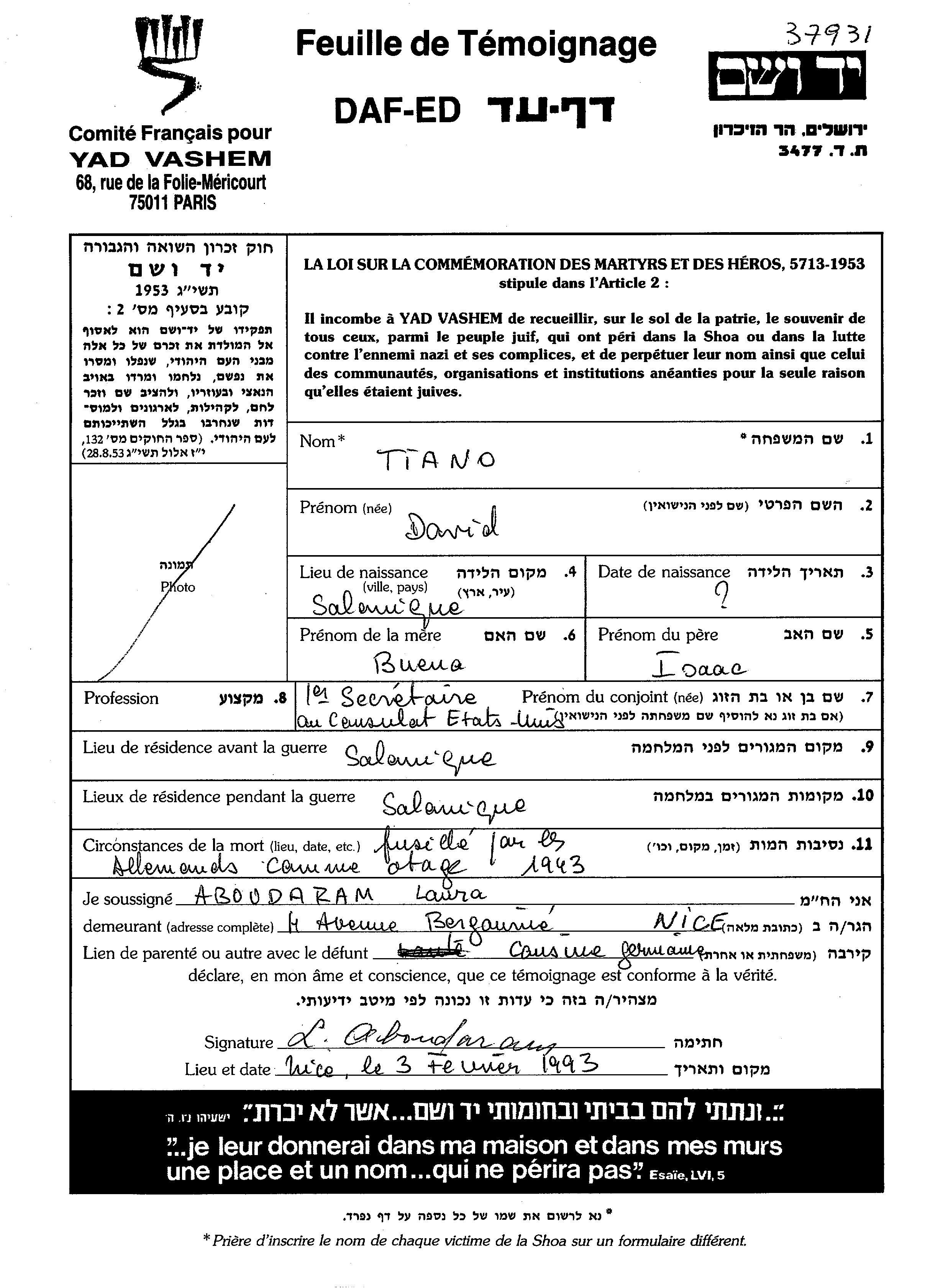 David Tiano wurde in Saloniki, Griechenland geboren. Er war der Sohn von Isaac und Buena. Er war Angestellte/-r. Vor dem Zweiten Weltkrieg lebte er in Saloniki, Griechenland. Während des Krieges war er in Saloniki, Griechenland.