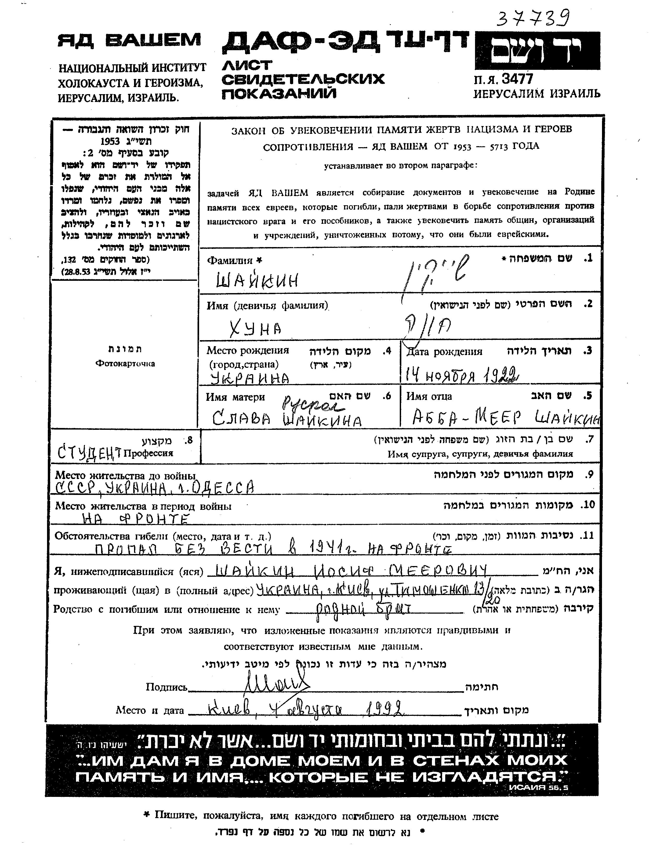 Khuna Shaikin wurde im Jahr 1922 in Ukraine (UdSSR) geboren. Er war der Sohn von Aba Meer und Slava, geb. Ruskol. Er war Student. Vor dem Zweiten Weltkrieg lebte er in Odessa, Ukraine (UdSSR). Während des Krieges war er in die Sowjetischen Streitkräfte.
