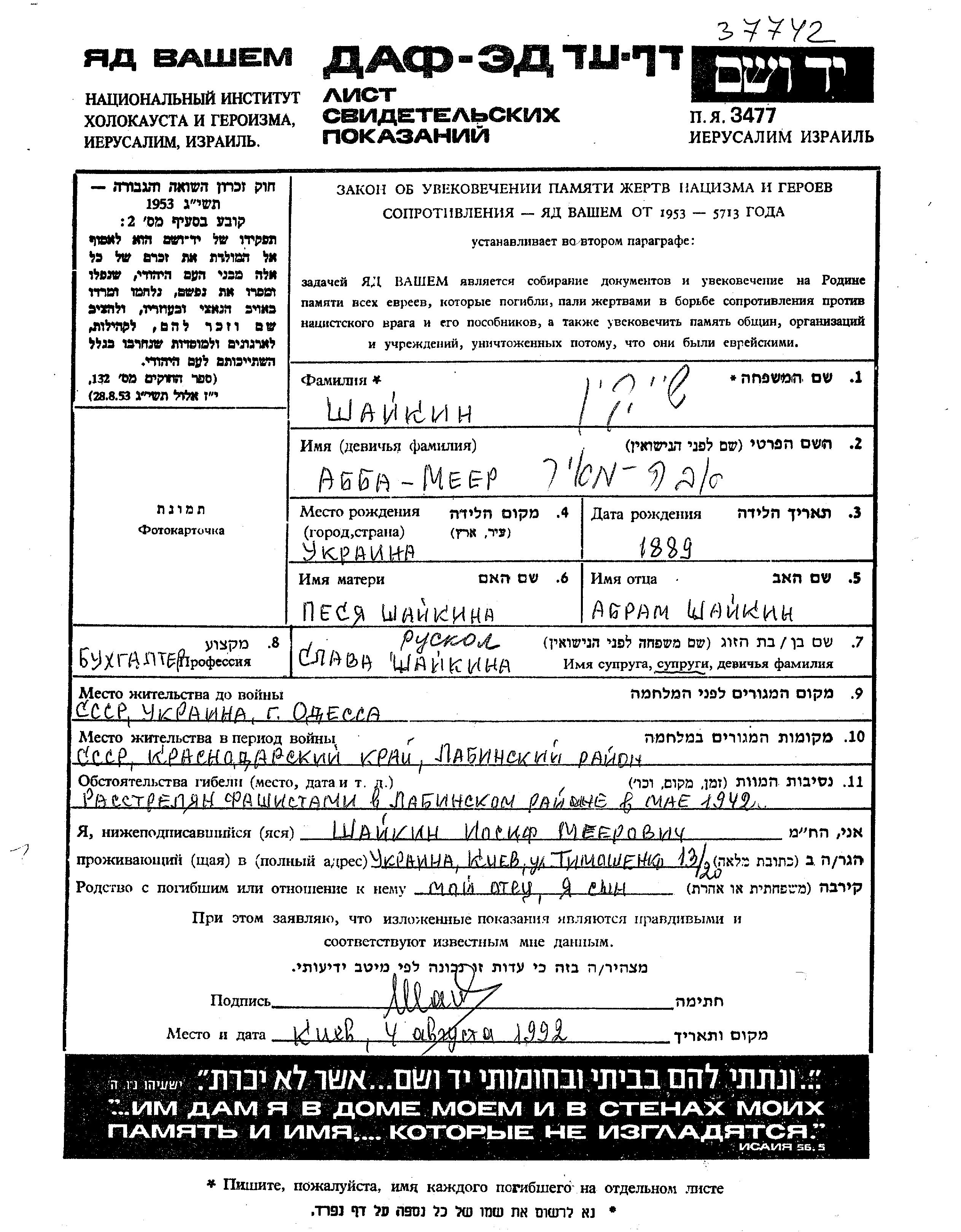Meer Aba Shaikin wurde im Jahr 1889 in Ukraine (UdSSR) geboren. Er war der Sohn von Abram und Pesia. Er war mit Slava Verheiratet. Vor dem Zweiten Weltkrieg lebte er in Odessa, Ukraine (UdSSR). Während des Krieges war er in Krasnodar, Russland (UdSSR).