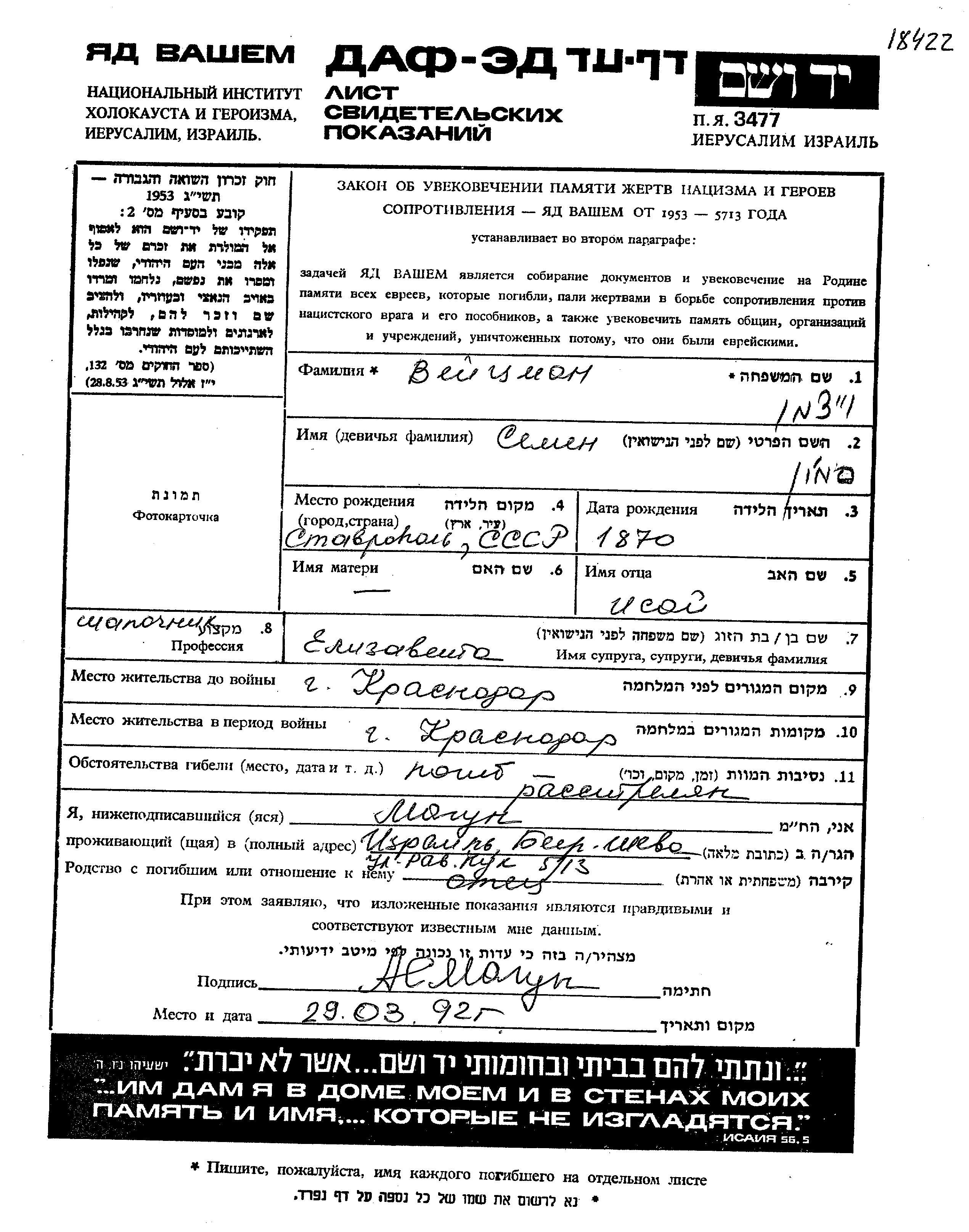 Semion Veitzman wurde im Jahr 1870 in Stavropol, Russland (UdSSR) geboren. Er war der Sohn von Isai. Er war Hutmacher/-in und mit Yelizaveta Verheiratet. Vor dem Zweiten Weltkrieg lebte er in Krasnodar, Russland (UdSSR). Während des Krieges war er in Krasnodar, Russland (UdSSR).
