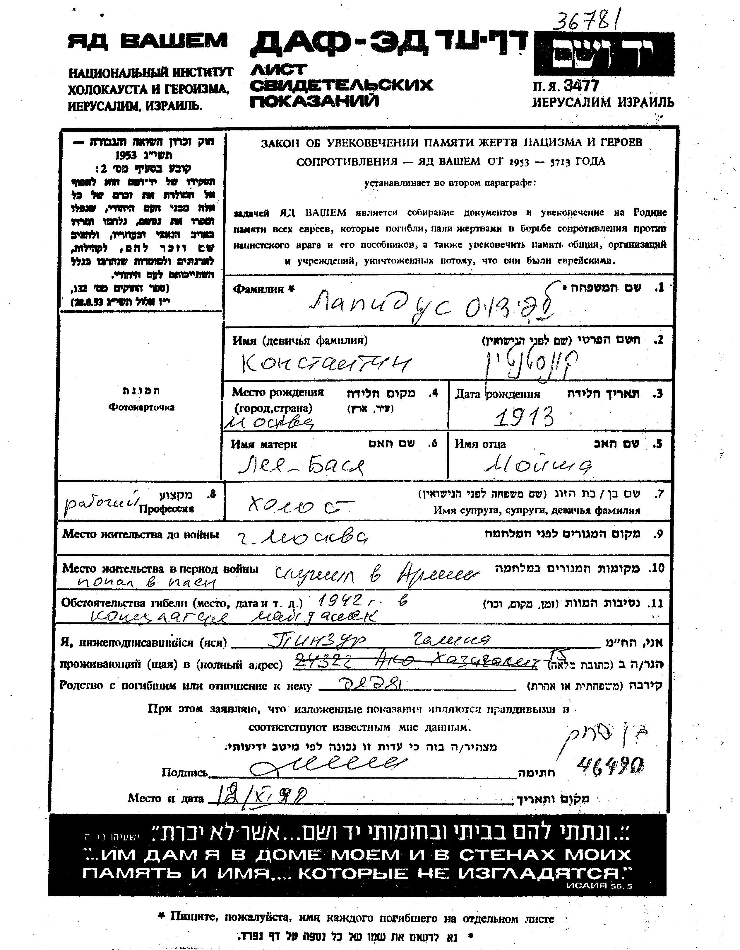 Konstantin Lapidus wurde im Jahr 1913 in Moskva, Russland (UdSSR) geboren. Er war der Sohn von Moishe und Basia Lea. Er war Arbeiter/-in und Ledig. Vor dem Zweiten Weltkrieg lebte er in Moskva, Russland (UdSSR). Während des Krieges war er in die Sowjetischen Streitkräfte.