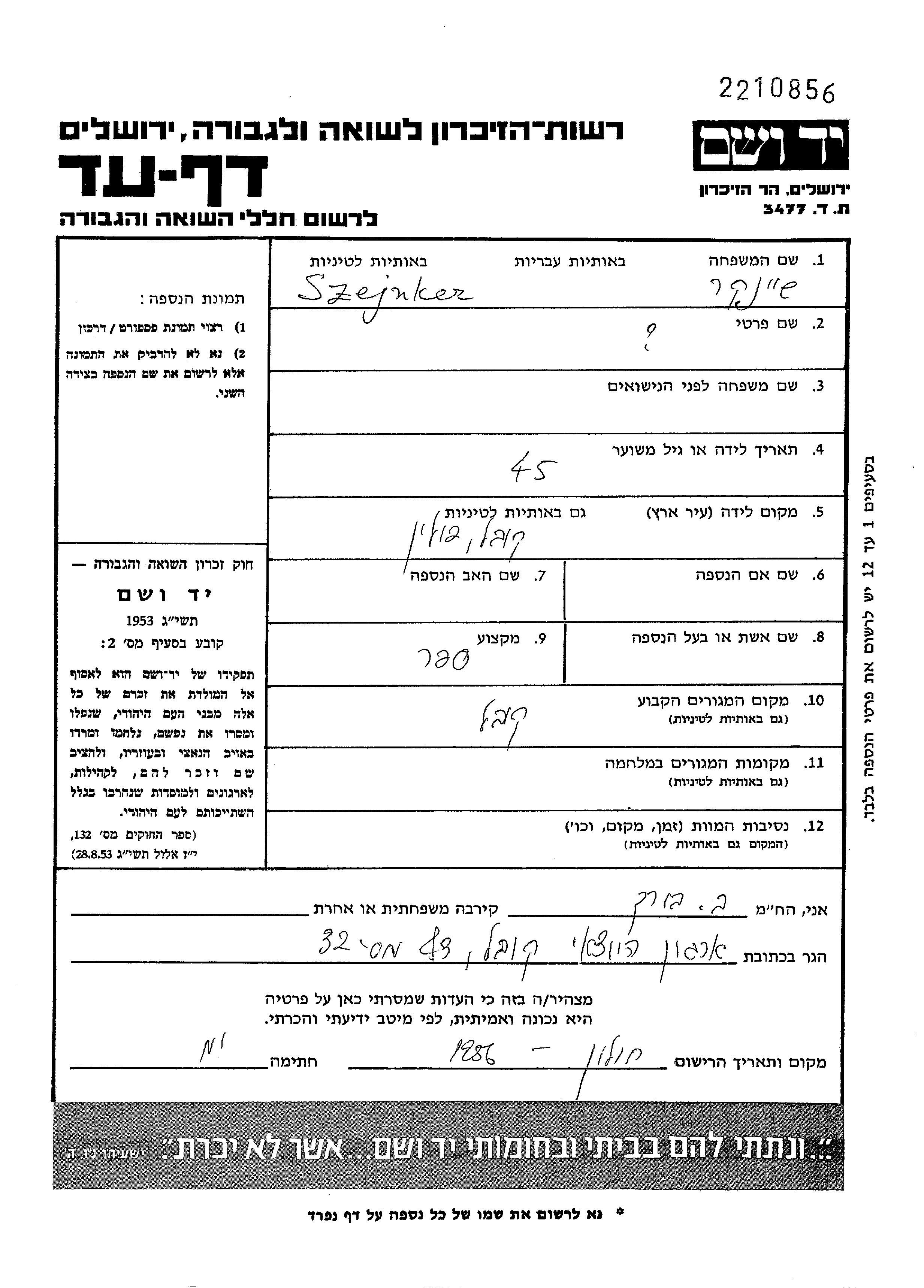Vorname unbekannt Szejnker wurde in Kowel, Polen geboren. Er war Friseur/-in. Vor dem Zweiten Weltkrieg lebte er in Kowel, Polen. Während des Krieges war er in Kowel, Polen.