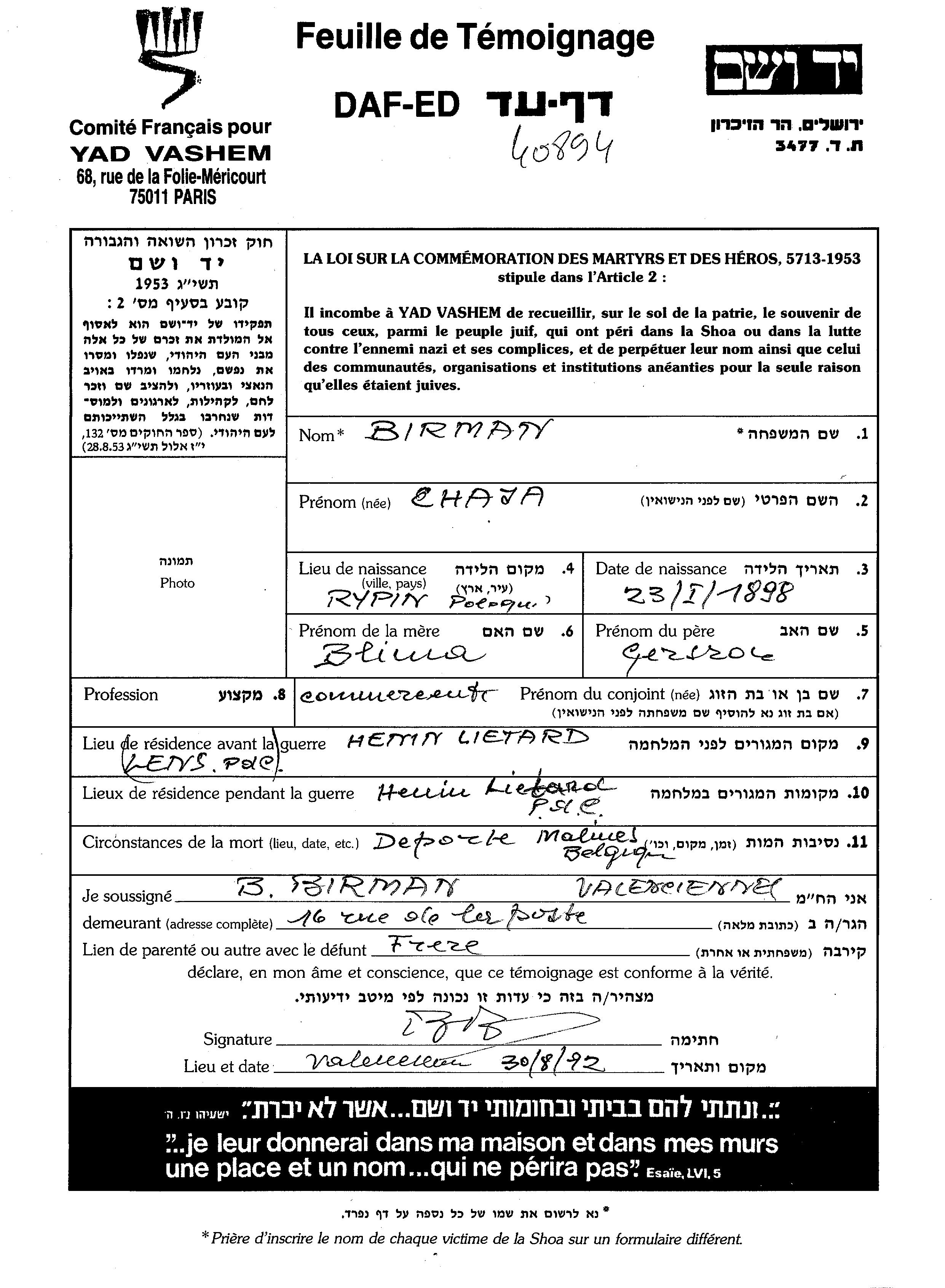 Chaya Birman wurde im Jahr 1898 in Rypin, Polen geboren. Sie war die Tochter von Gerszon und Blima, geb. Pozner. Sie war Kaufmann/-frau. Vor dem Zweiten Weltkrieg lebte sie in Henin Lietard, Frankreich. Während des Krieges war sie in Henin Lietard, Frankreich.