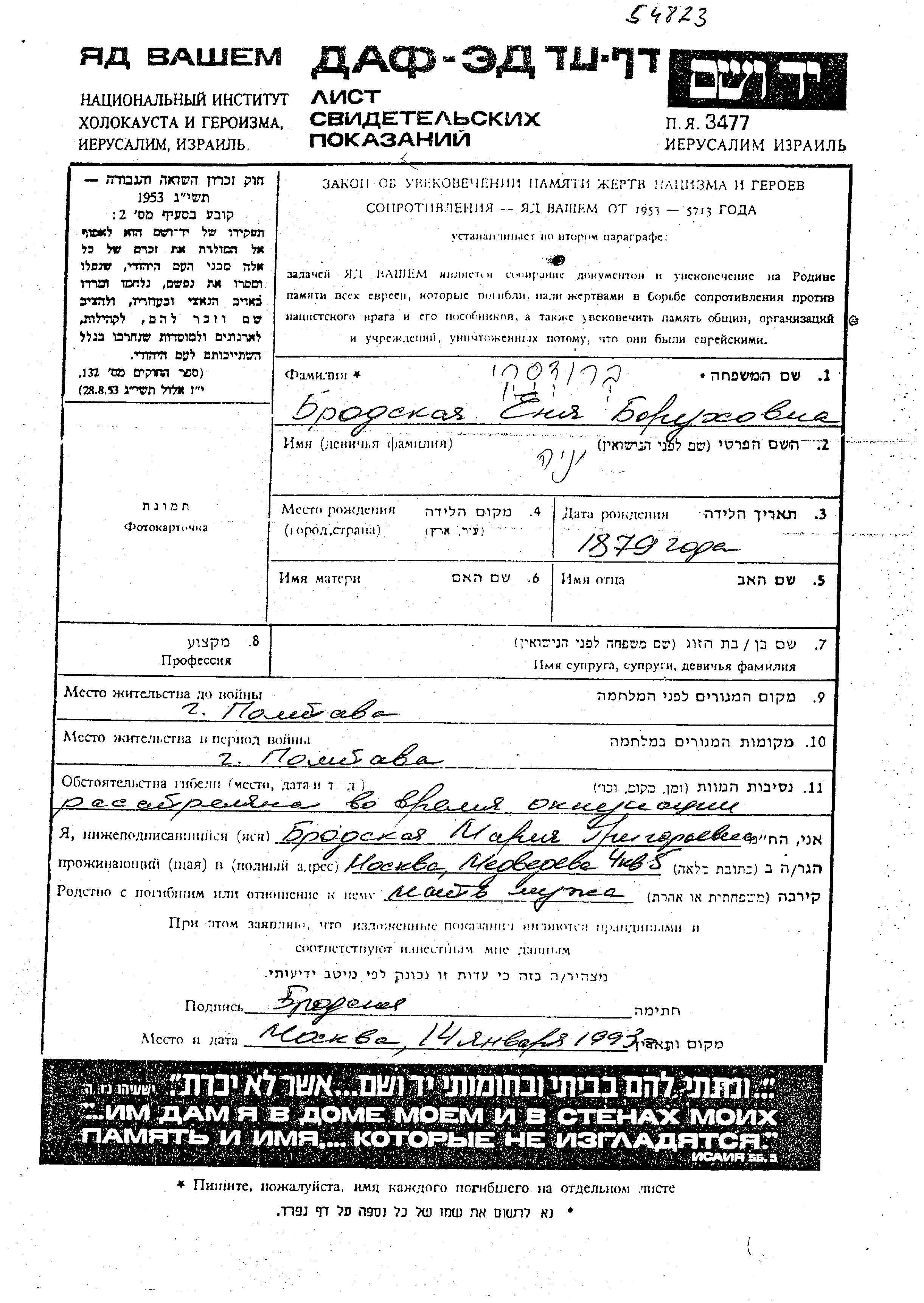 Enia Yanya Brodskaya wurde im Jahr 1879 geboren. Sie war mit Mordekhai Verheiratet. Vor dem Zweiten Weltkrieg lebte sie in Poltava, Ukraine (UdSSR). Während des Krieges war sie in Poltava, Ukraine (UdSSR).
