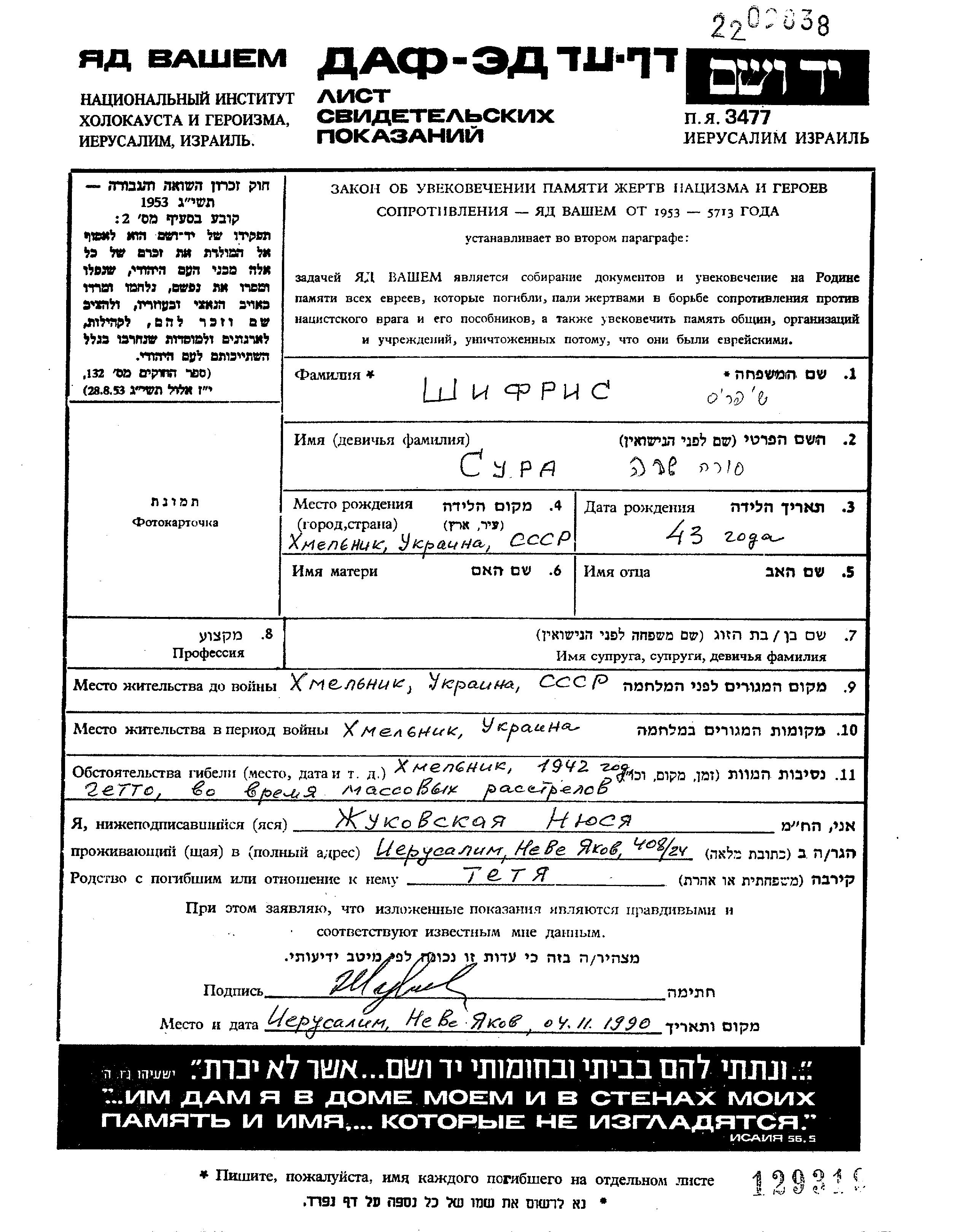 Sura Shifris wurde in Khmelnik, Ukraine (UdSSR) geboren. Sie war mit Motl Verheiratet. Vor dem Zweiten Weltkrieg lebte sie in Khmelnik, Ukraine (UdSSR). Während des Krieges war sie in Khmelnik, Ukraine (UdSSR).