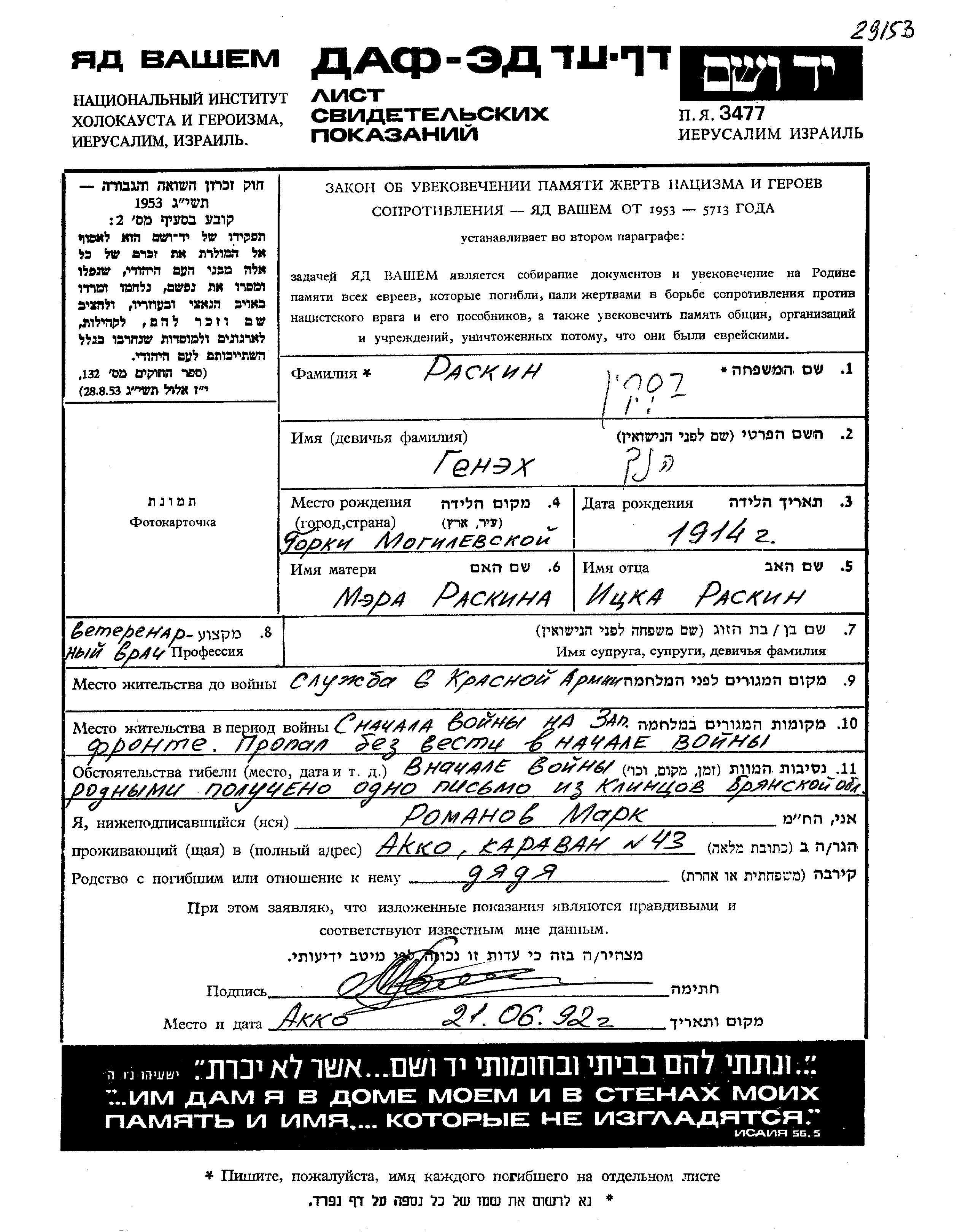 Henekh Raskin wurde im Jahr 1914 in Gorki, Weißrussland (UdSSR) geboren. Er war der Sohn von Itzka Itzka und Mera, geb. Sheinin. Er war Tierarzt. Vor dem Zweiten Weltkrieg lebte er in die Sowjetischen Streitkräfte. Während des Krieges war er in die Sowjetischen Streitkräfte.