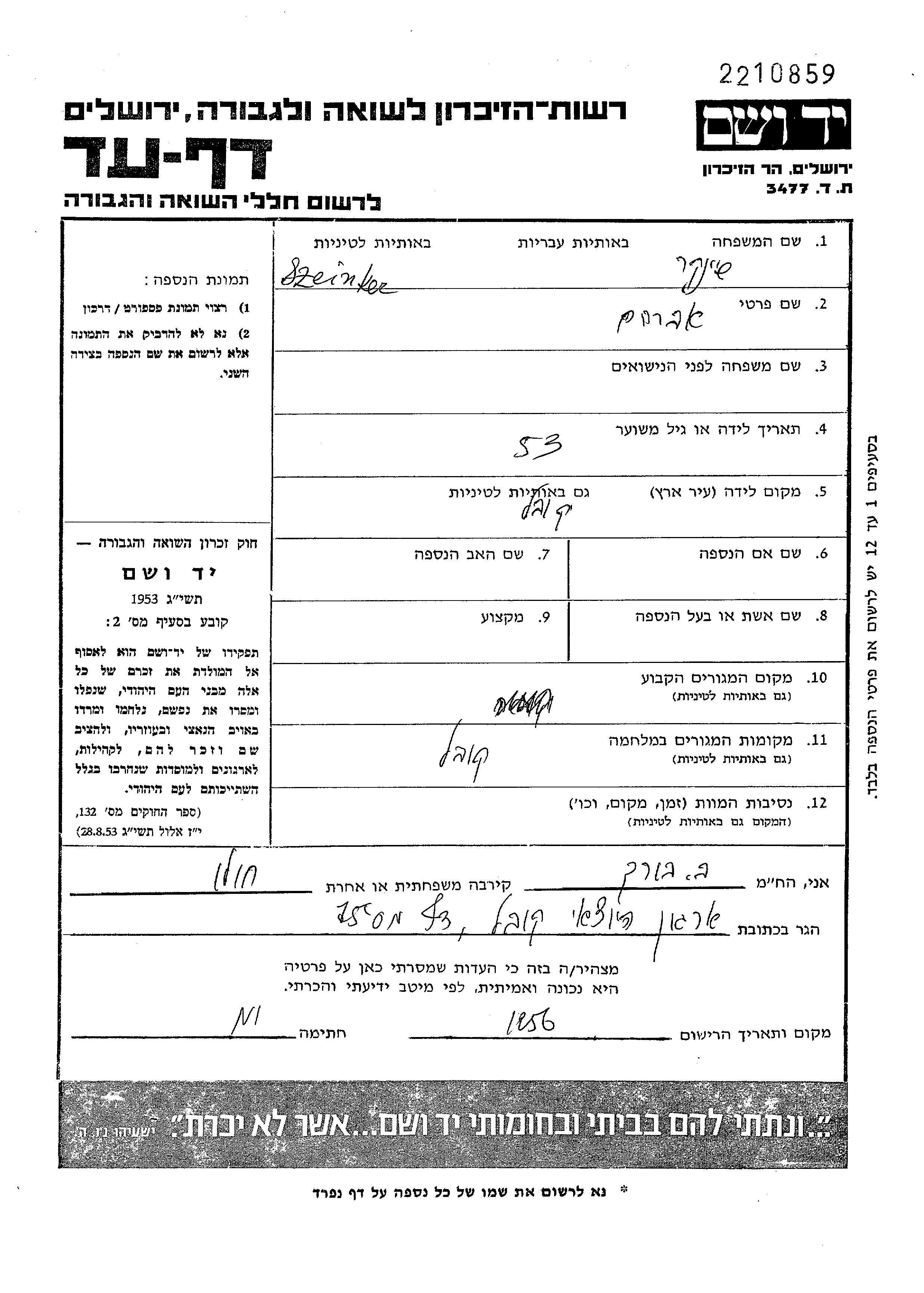 Avraham Szeinker wurde in Kowel, Polen geboren. Vor dem Zweiten Weltkrieg lebte er in Kowel, Polen. Während des Krieges war er in Kowel, Polen.