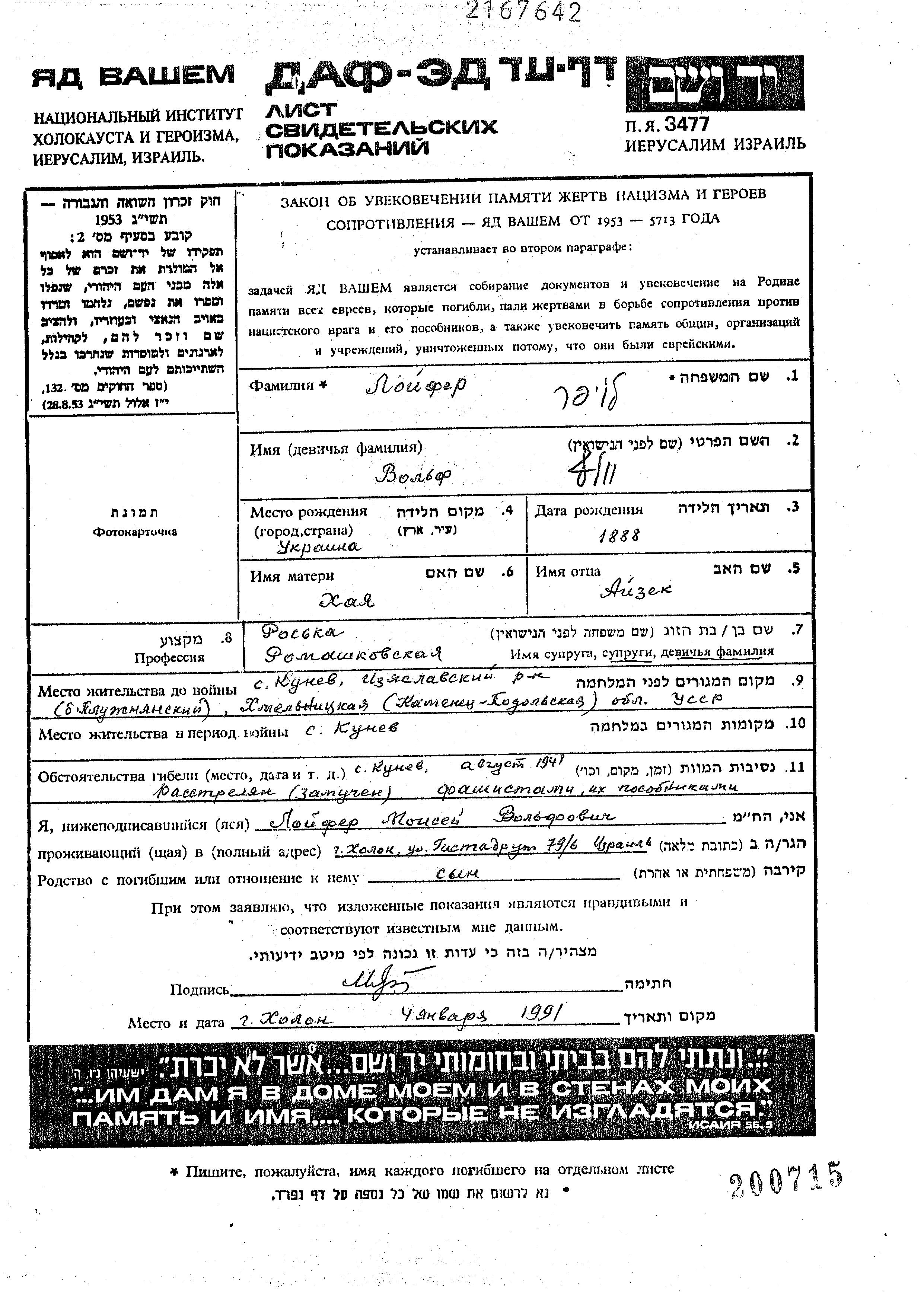 Volf Loifer wurde im Jahr 1888 in Ukraine (UdSSR) geboren. Er war der Sohn von Aizek und Khaia. Er war mit Roza Verheiratet. Vor dem Zweiten Weltkrieg lebte er in Kunev, Ukraine (UdSSR). Während des Krieges war er in Kunev, Ukraine (UdSSR).