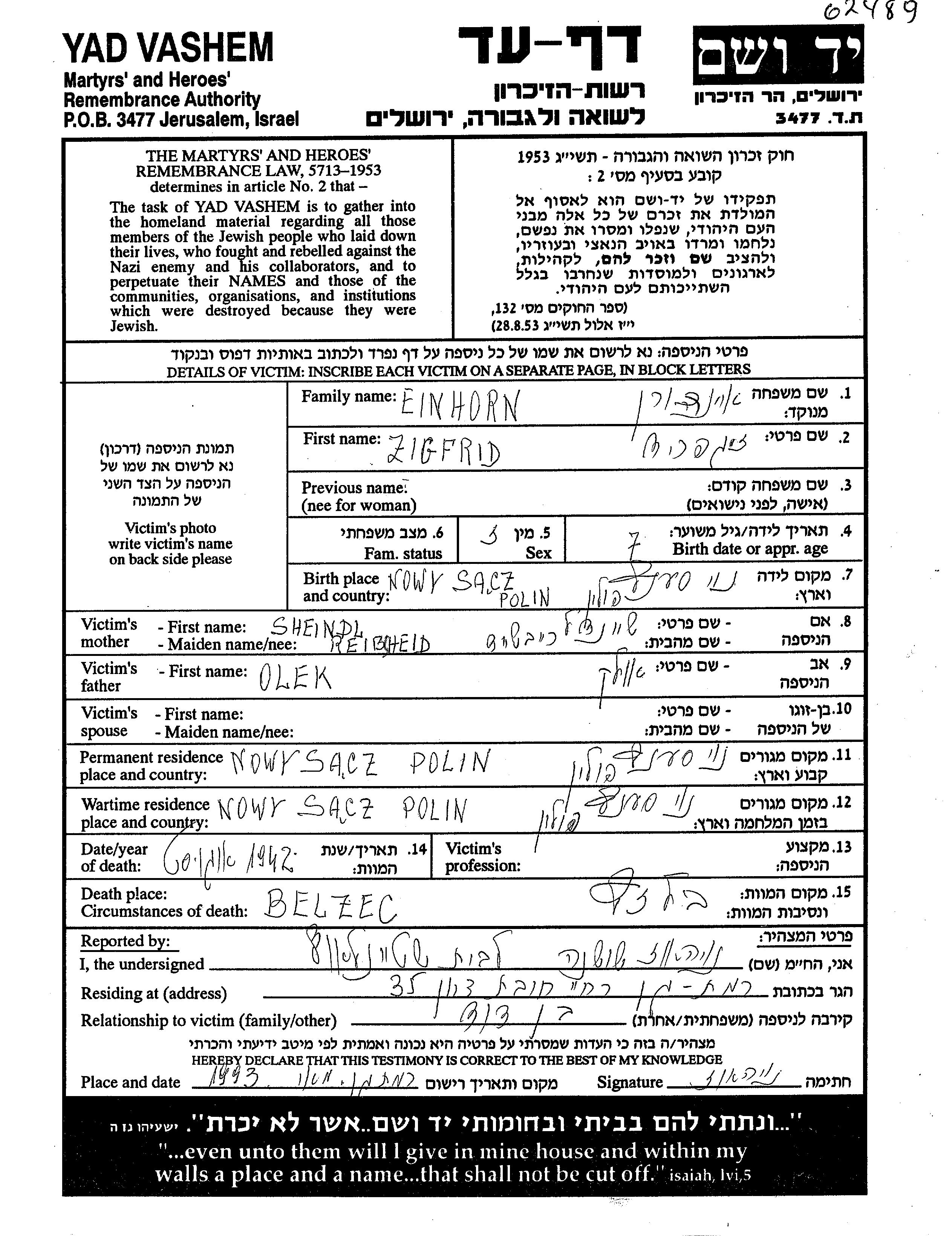 Zigfrid Einhorn wurde in Nowy Sacz, Polen geboren. Er war der Sohn von Olek und Sheindl, geb. Reibsheid. Er war Kind. Vor dem Zweiten Weltkrieg lebte er in Nowy Sacz, Polen. Während des Krieges war er in Nowy Sacz, Polen.