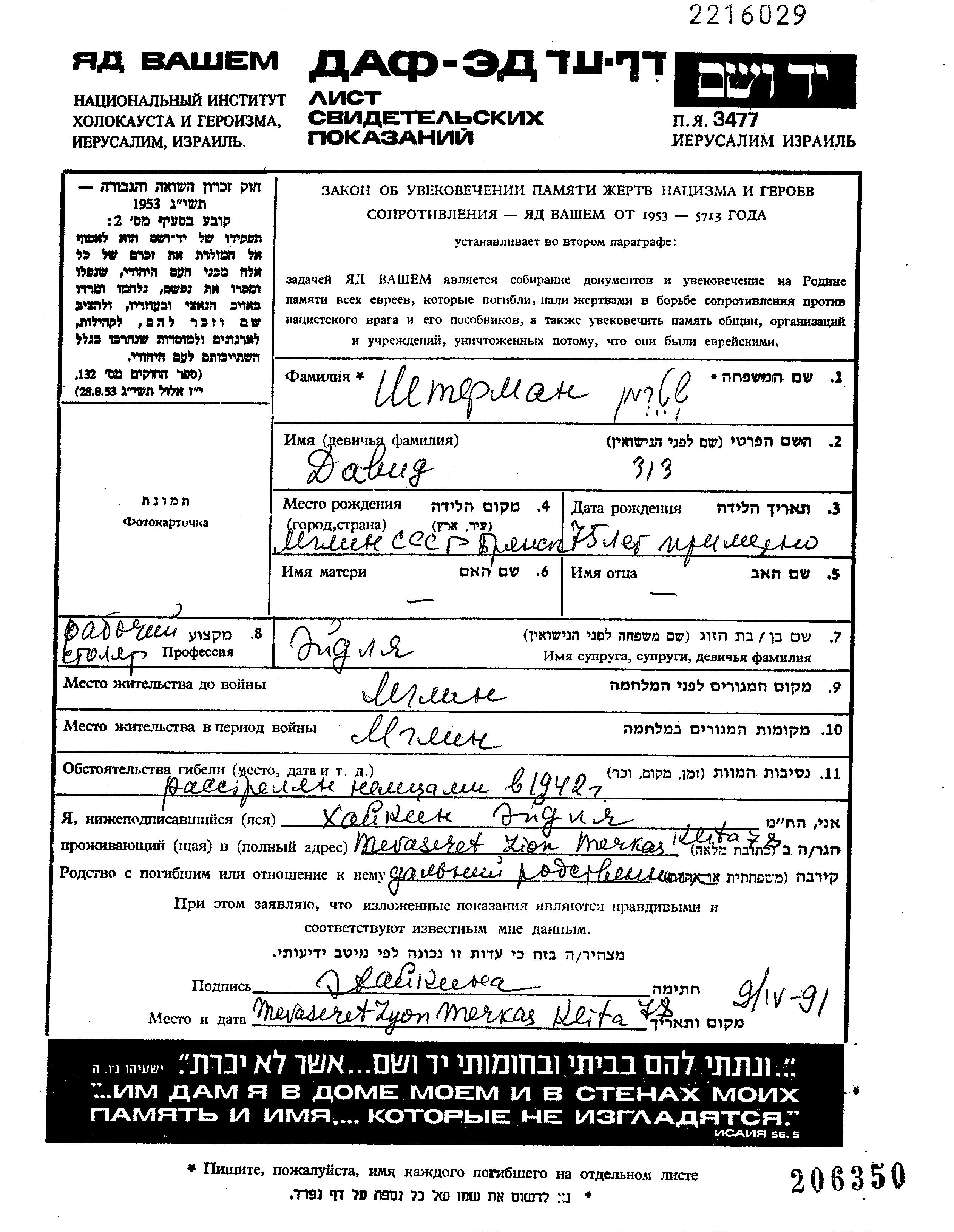 David Shterman wurde in Mglin, Russland (UdSSR) geboren. Er war Zimmermann und mit Eidlya Verheiratet. Vor dem Zweiten Weltkrieg lebte er in Mglin, Russland (UdSSR). Während des Krieges war er in Mglin, Russland (UdSSR).