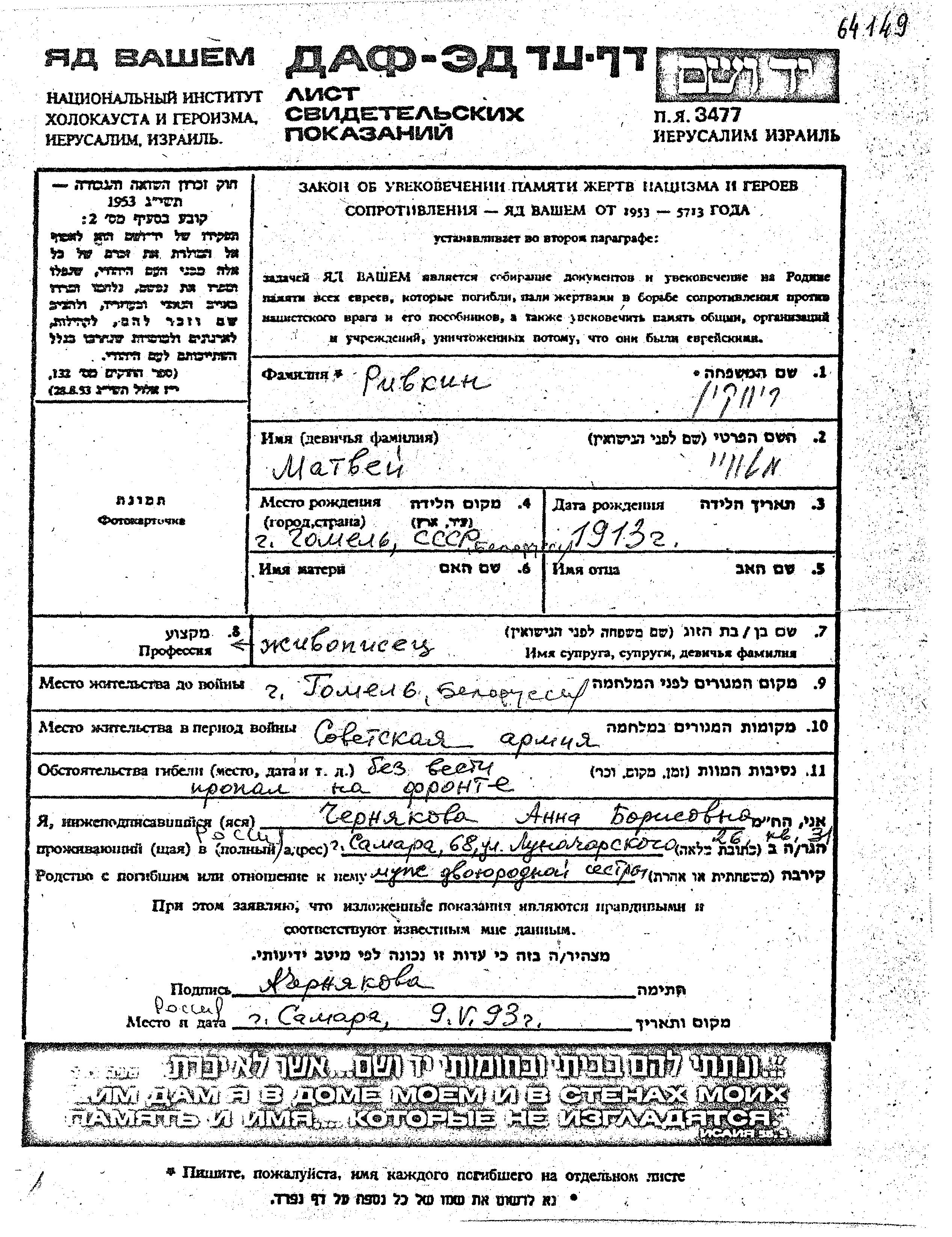 Rivkin Matvei 1913 Gomel, Weißrussland (UdSSR) Gedenkblatt