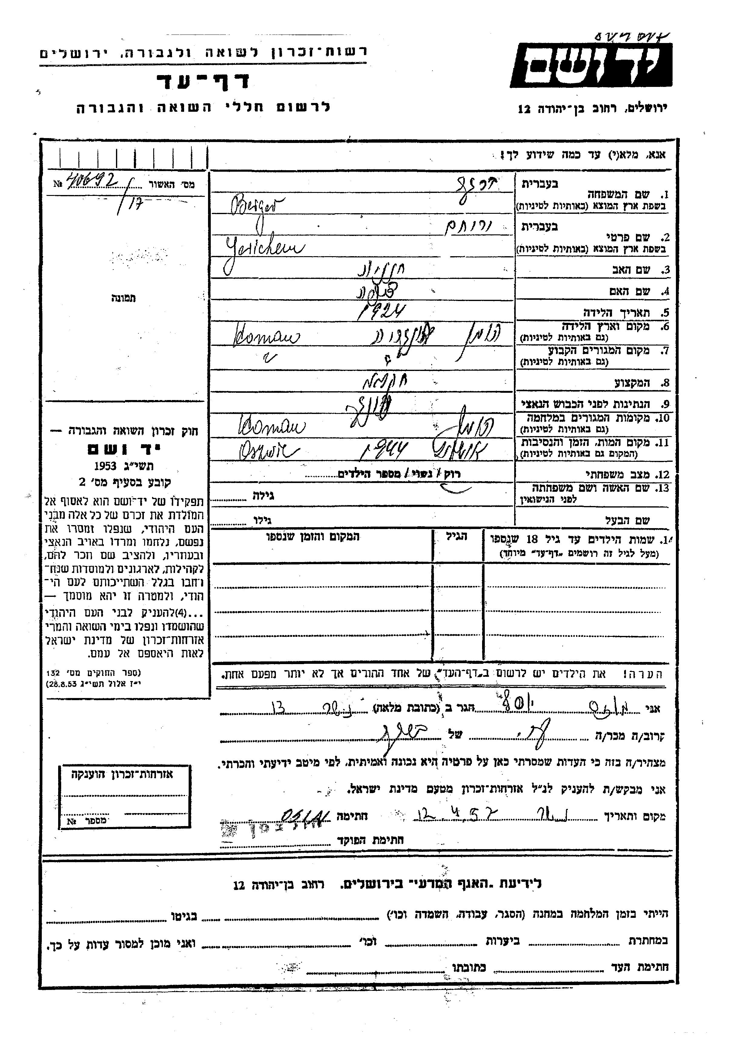 Jerichem Berger wurde im Jahr 1924 in Homan, Tschechoslowakei geboren. Er war der Sohn von Khanania und Tzipa. Er war Landwirt und Ledig. Vor dem Zweiten Weltkrieg lebte er in Homan, Tschechoslowakei. Während des Krieges war er in Homan, Tschechoslowakei.