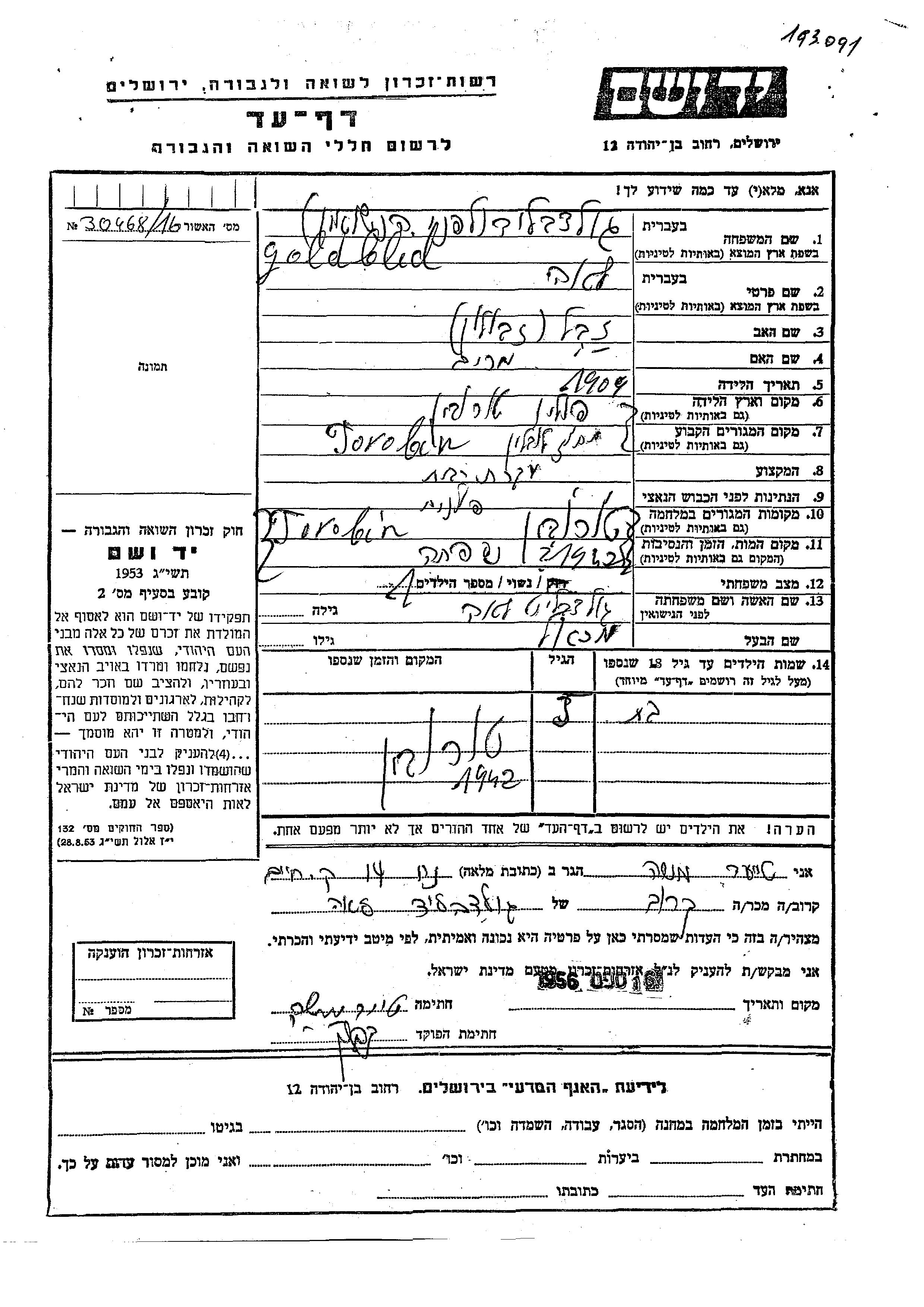 Lea Goldblid, geb. Goldblit wurde im Jahr 1904 in Torobin, Polen geboren. Sie war die Tochter von Zavel Zevulun und Miriam. Sie war Hausfrau und mit Mekhael Verheiratet. Vor dem Zweiten Weltkrieg lebte sie in Torobin, Polen. Während des Krieges war sie in Torobin, Polen.