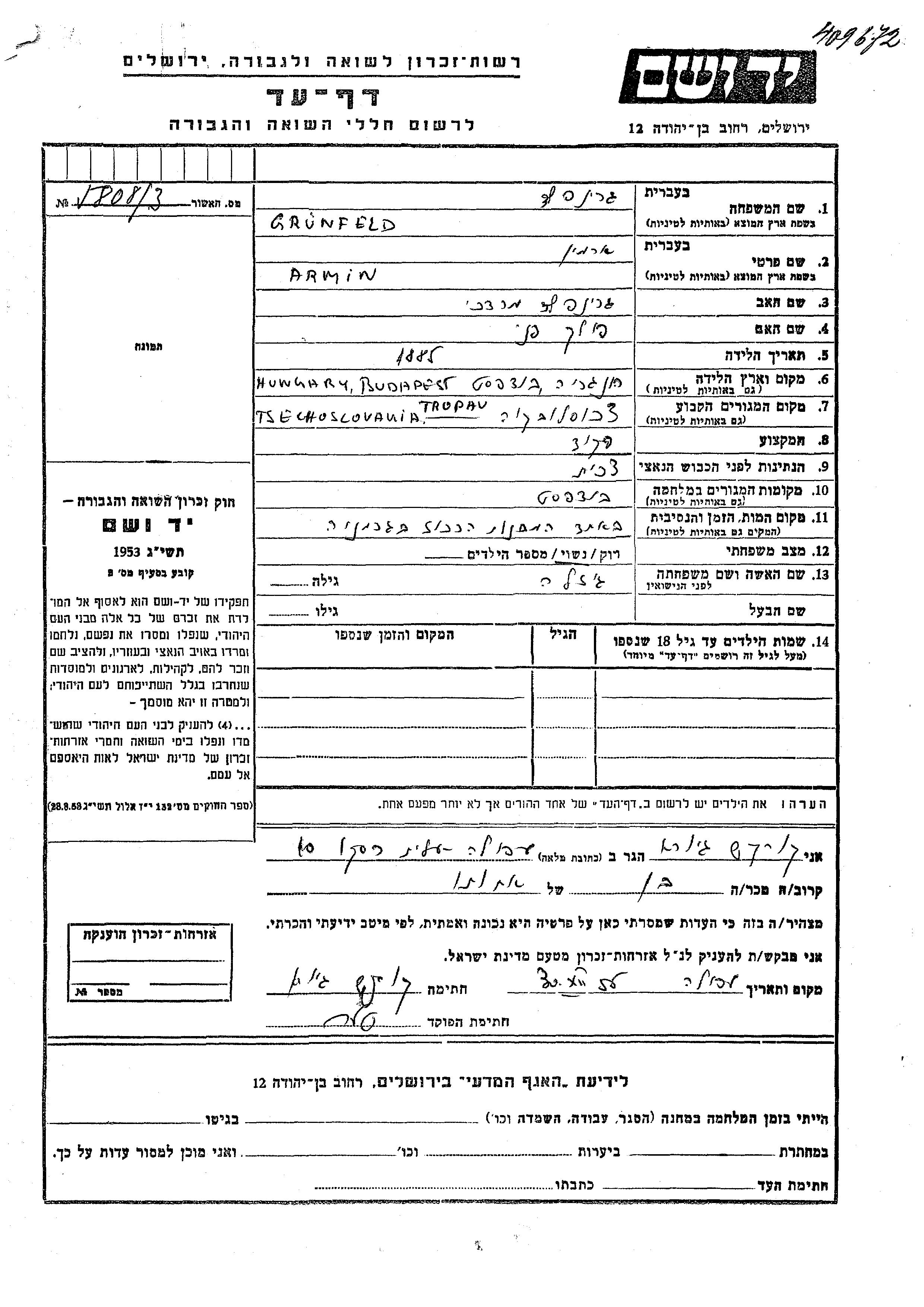Armin Grunfeld wurde im Jahr 1885 in Budapest, Ungarn geboren. Er war der Sohn von Mordekhai und Fani. Er war Angestellte/-r und mit Gizela Verheiratet. Vor dem Zweiten Weltkrieg lebte er in Troppau, Tschechoslowakei. Während des Krieges war er in Budapest, Ungarn.