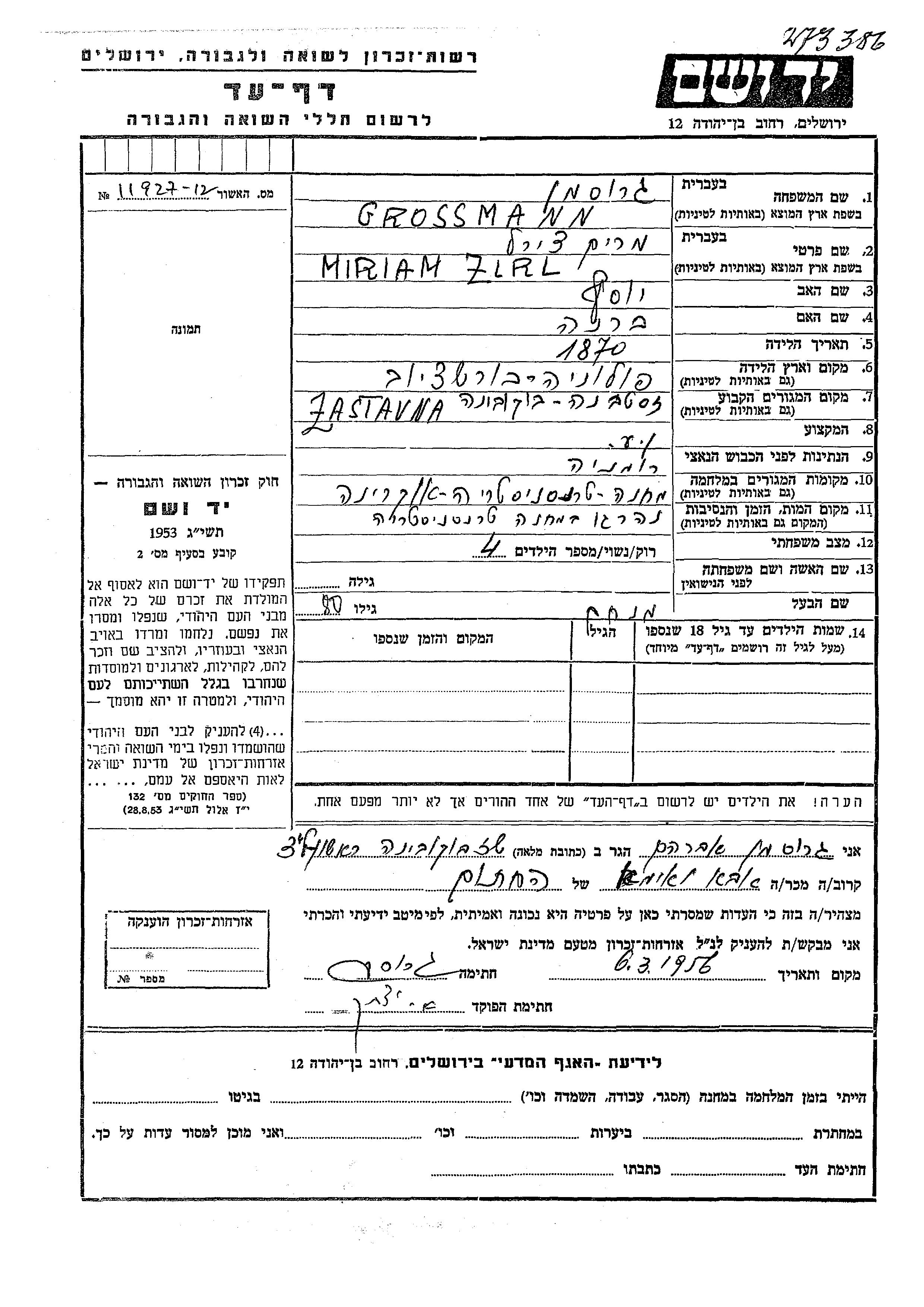 Zirl Miriam Grossman wurde im Jahr 1870 in Borszczow, Polen geboren. Sie war die Tochter von Yosef und Brakha. Sie war ו.ע. und mit Menakhem Verheiratet. Vor dem Zweiten Weltkrieg lebte sie in Zastavna, Rumänien. Während des Krieges war sie in Transnistria, Ukraine (UdSSR).