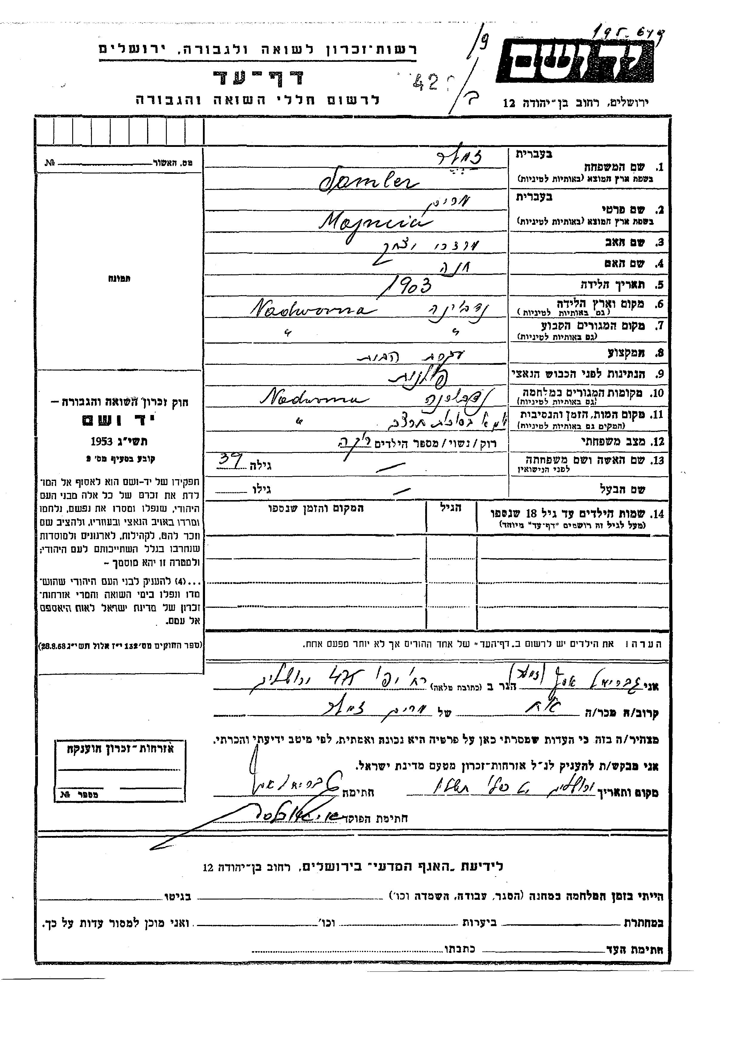 Majncia Miriam Samler Zamler wurde im Jahr 1903 in Nadworna, Polen geboren. Sie war die Tochter von Mordekhai Yitzkhak und Khana. Sie war Hausfrau und Ledig. Vor dem Zweiten Weltkrieg lebte sie in Nadworna, Polen. Während des Krieges war sie in Nadworna, Polen.