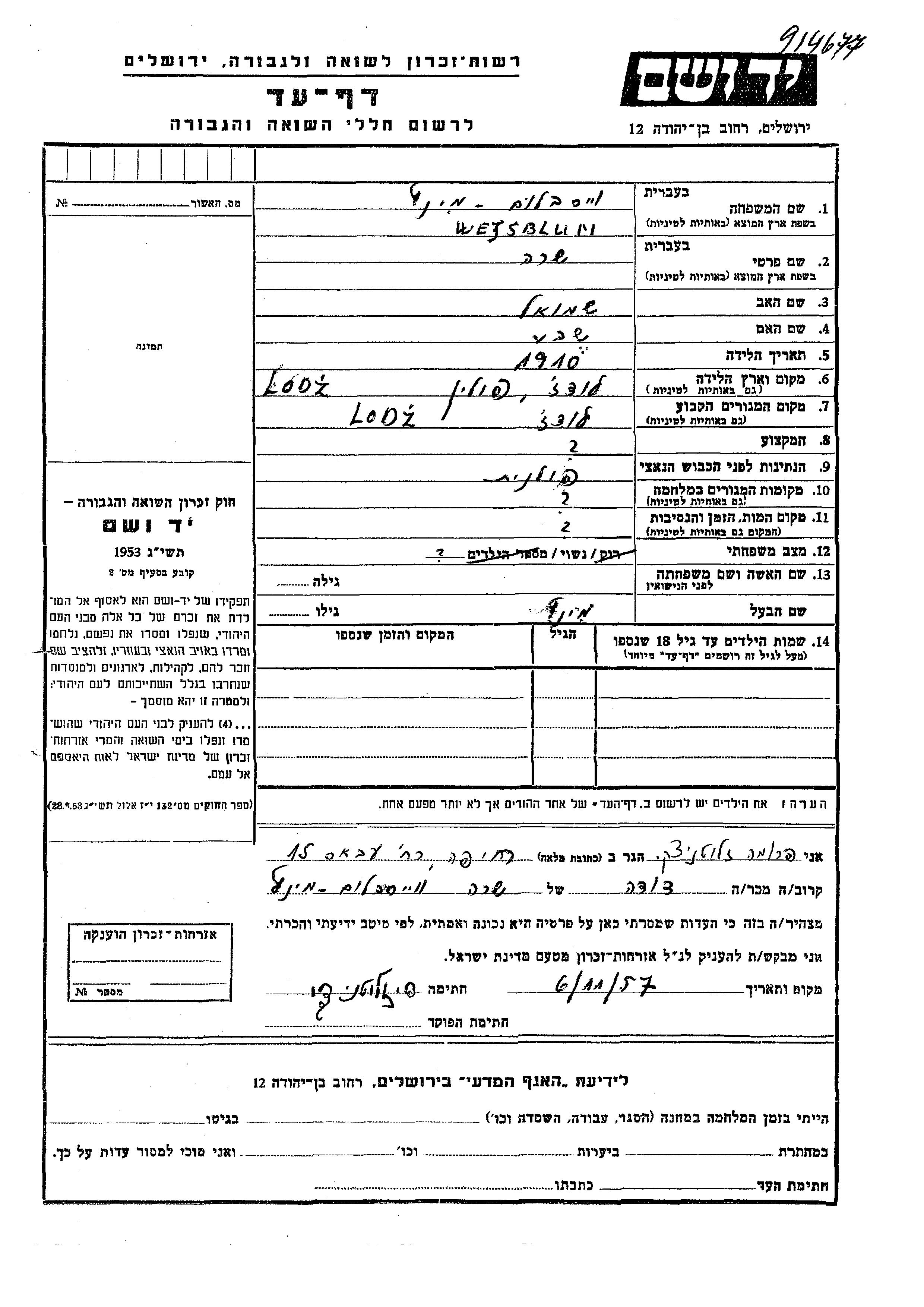 Wejsblum Mintz Sara 1910 Lodz, Polen Gedenkblatt