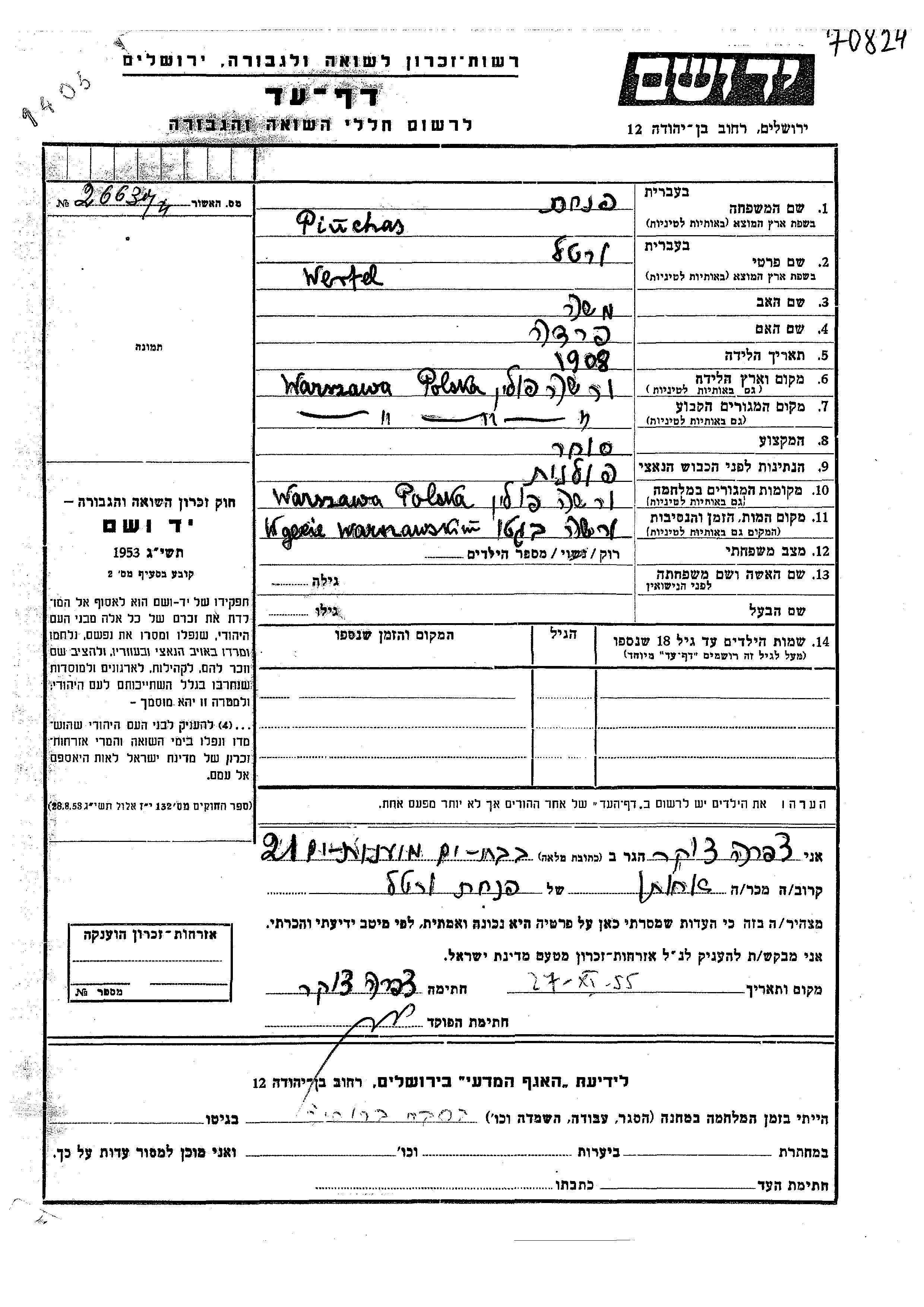 Wertel Pinchas wurde im Jahr 1908 in Warszawa, Polen geboren. Er war der Sohn von Moshe und Freida. Er war Kaufmann/-frau und Ledig. Vor dem Zweiten Weltkrieg lebte er in Warszawa, Polen. Während des Krieges war er in Warszawa, Polen.