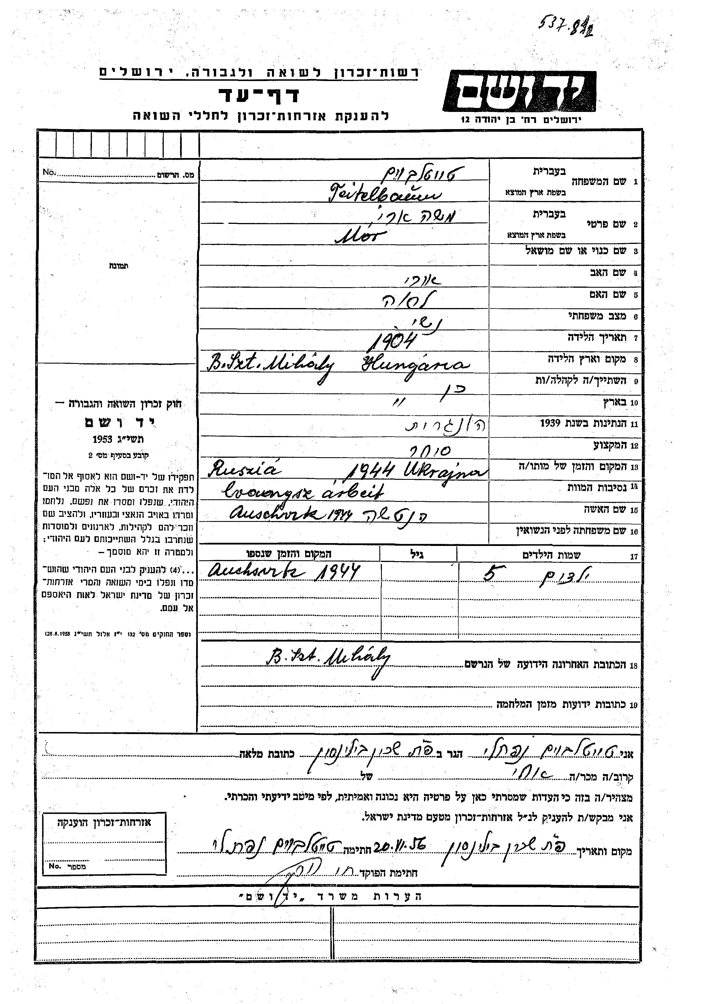 Moshe Arie Mor wurde in der Schoah ermordet. Todesort: Ukraine (UdSSR) im Jahr 1944.