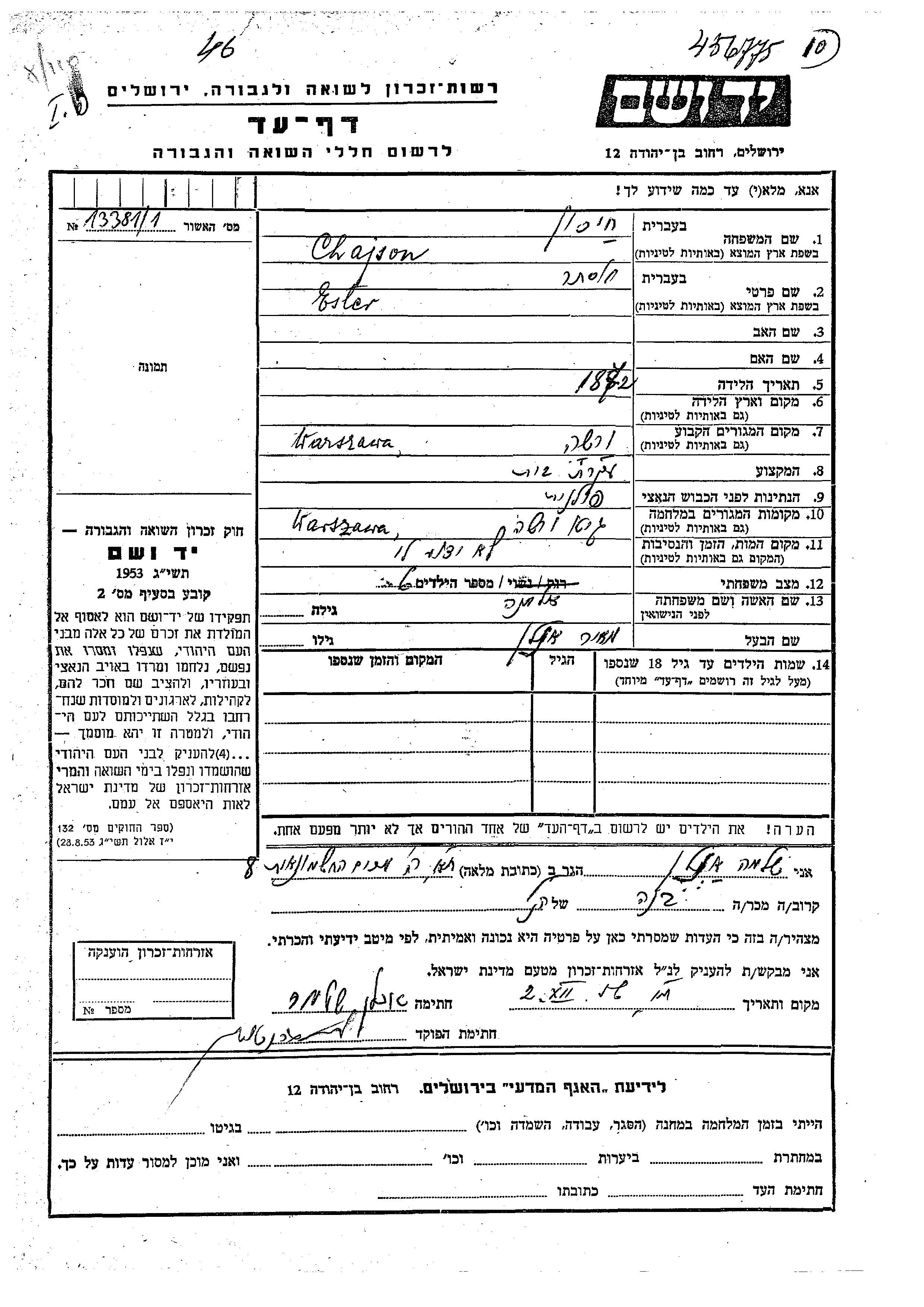 Ester Chajson Khason wurde im Jahr 1872 geboren. Sie war Hausfrau und mit Meir Witwe. Vor dem Zweiten Weltkrieg lebte sie in Warsaw, Polen. Während des Krieges war sie in Warsaw, Polen.