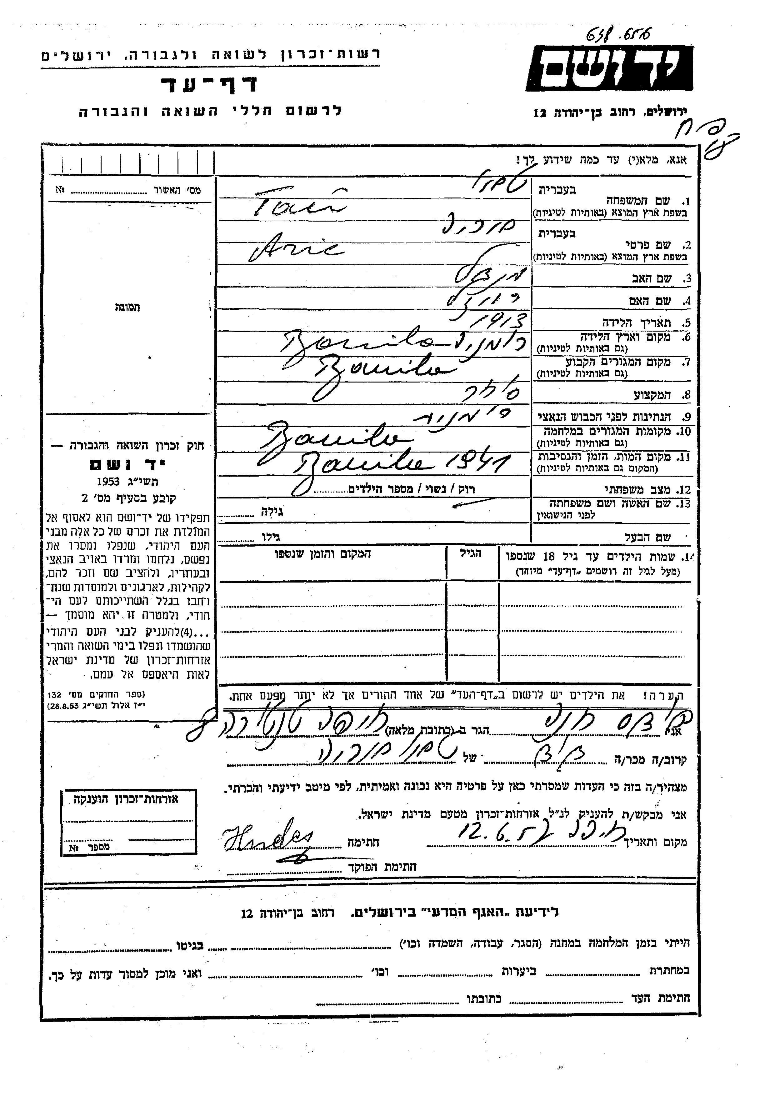 Arie Tau wurde im Jahr 1913 in Banila Siret, Rumänien geboren. Er war der Sohn von Mendel und Reizl. Er war Kaufmann/-frau und Ledig. Vor dem Zweiten Weltkrieg lebte er in Banila Siret, Rumänien. Während des Krieges war er in Banila Siret, Rumänien.