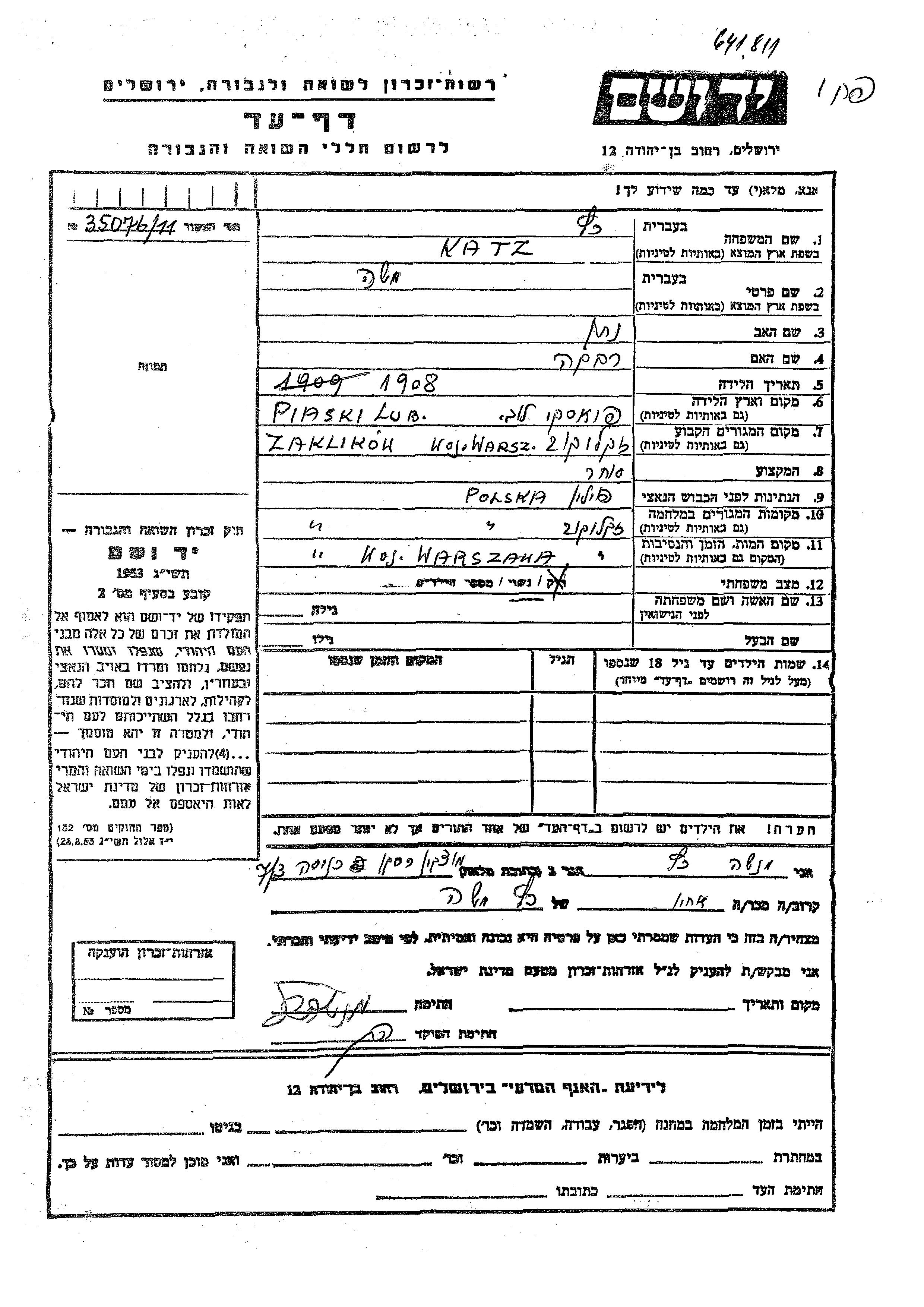 Moshe Katz wurde im Jahr 1908 in Piaski, Polen geboren. Er war der Sohn von Natan und Rivka. Er war Kaufmann/-frau und Verheiratet. Vor dem Zweiten Weltkrieg lebte er in Zaklikow, Polen. Während des Krieges war er in Zaklikow, Polen.