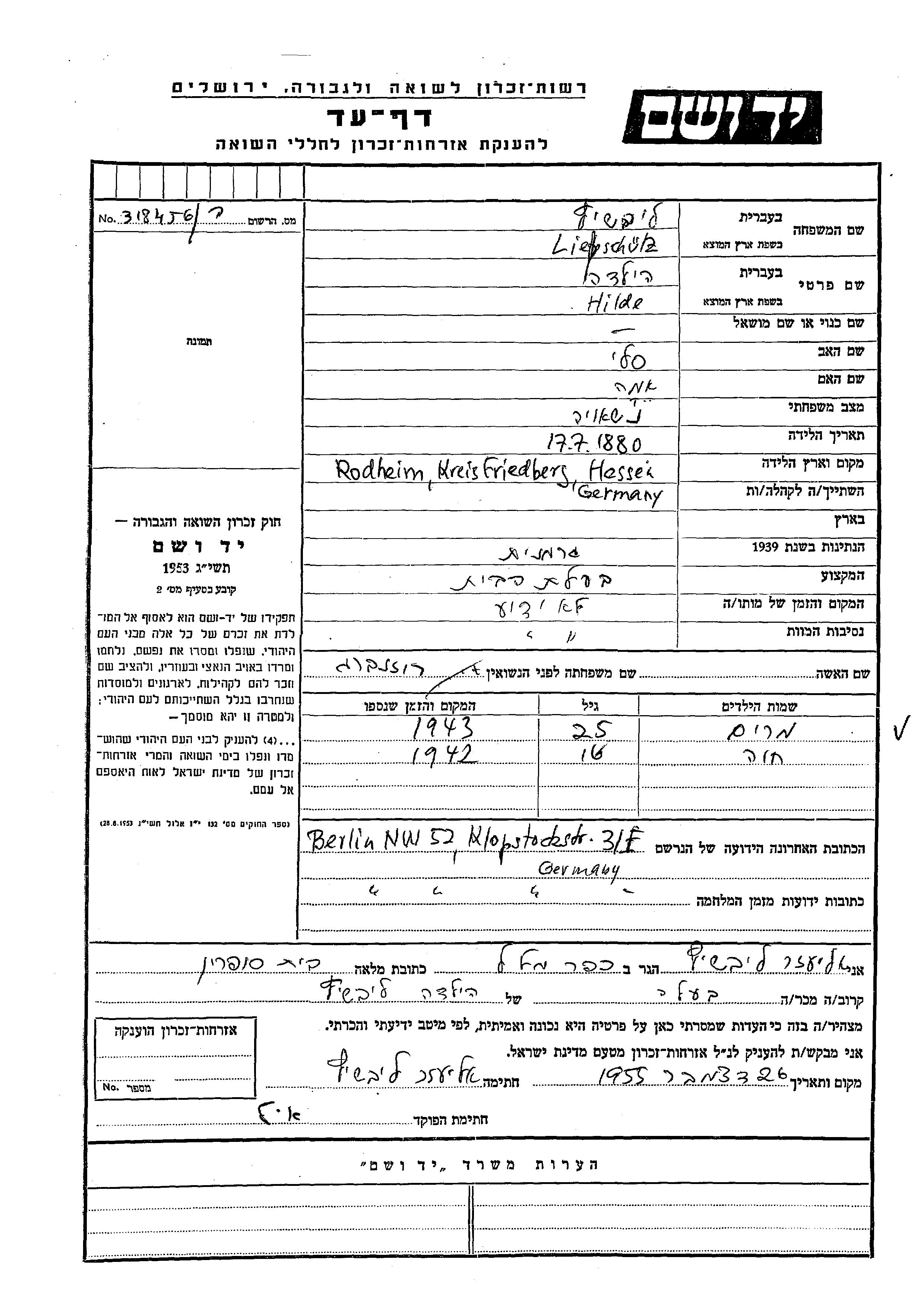 Suche nach einem Todesjahr im Zeitraum der Holocaust: 1933 bis 1945. Bitte wählen Sie 'Exakt' im Auswahlmenü, um nur nach einem einzelnen Jahr zu suchen, alternativ können Sie die flexibleren Optionen '+/- 2 Jahre' oder '+/- 5 Jahre' wählen.