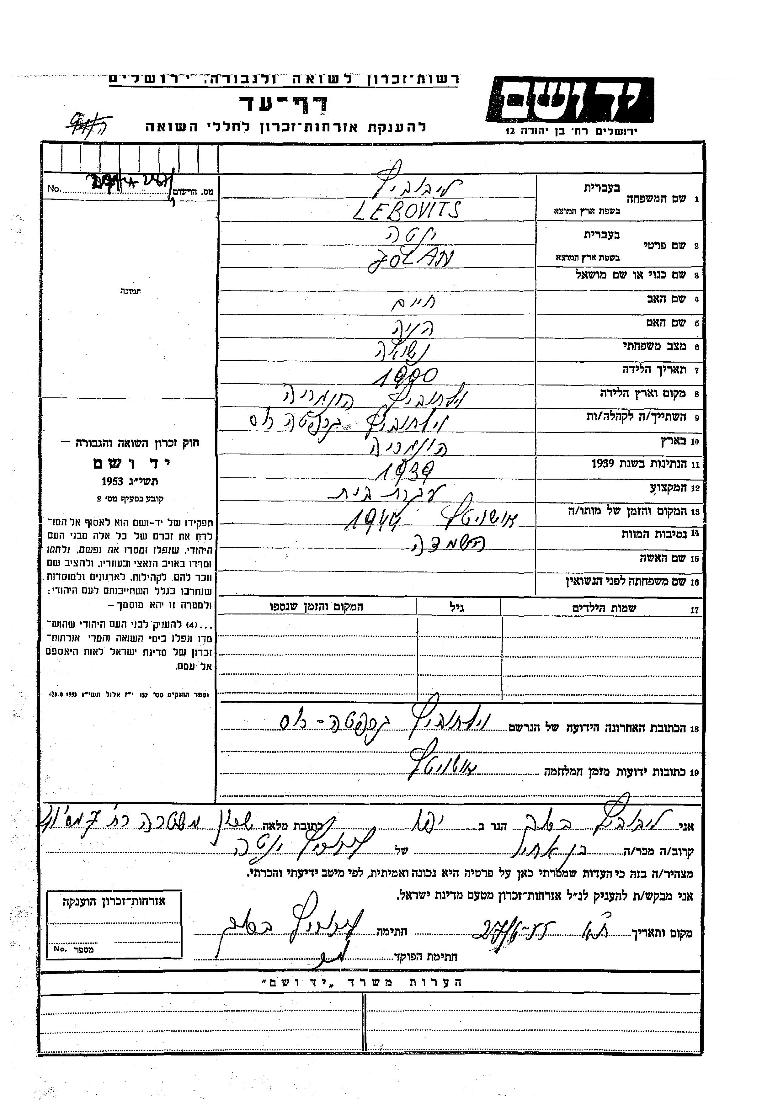 Jolan Yenta Lebovits wurde im Jahr 1900 in Vilhovitz, Tschechoslowakei geboren. Sie war die Tochter von Khaim und Henia. Sie war Hausfrau und Verheiratet. Vor dem Zweiten Weltkrieg lebte sie in Vilhovitz, Tschechoslowakei. Während des Krieges war sie in Auschwitz, Polen.