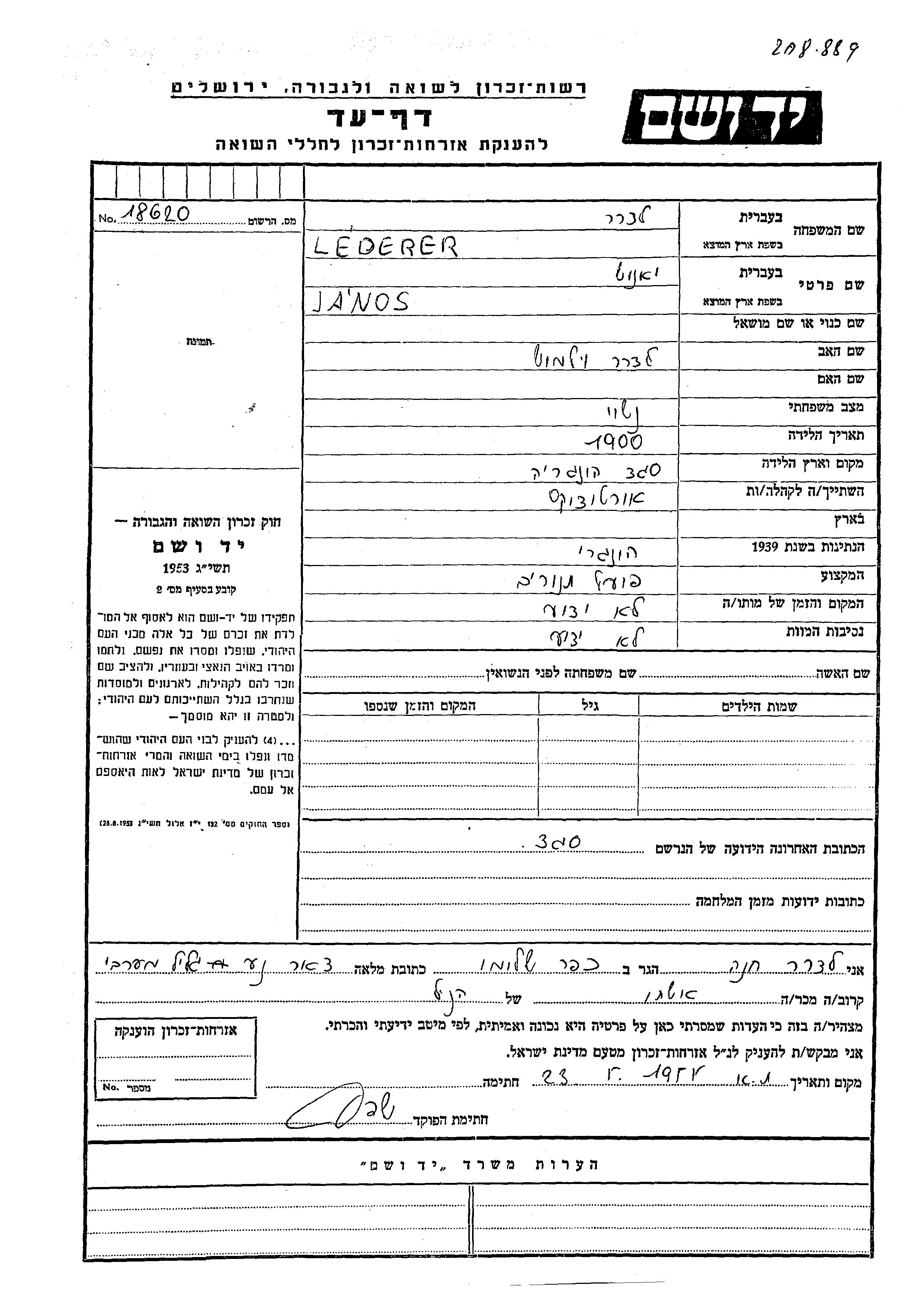 Janos Lederer wurde im Jahr 1900 in Szeged, Ungarn geboren. Er war der Sohn von Vilmosh. Er war פועל תנורים und Verheiratet. Während des Krieges war er in Szeged, Ungarn.